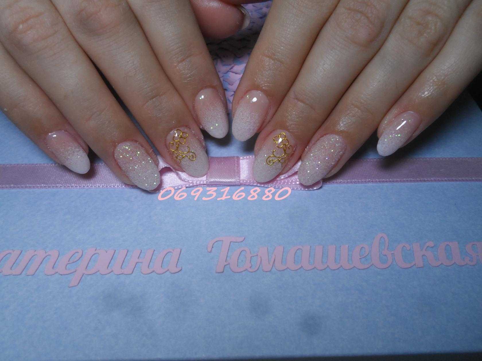 Нюдовый. Растяжка блестками на нюдовой основе смотрится одинаково стильно, как на длинных, так и на очень коротких ногтях. Как и в случае с белоснежным покрытием, в данном случае уместными будут полупрозрачные основы, так и высокопигментированные бежевого или коричневого цвета. А вот блестки должны быть исключительно золотого цвета, иначе готовый нейл-арт будет выглядеть грубо и неопрятно.