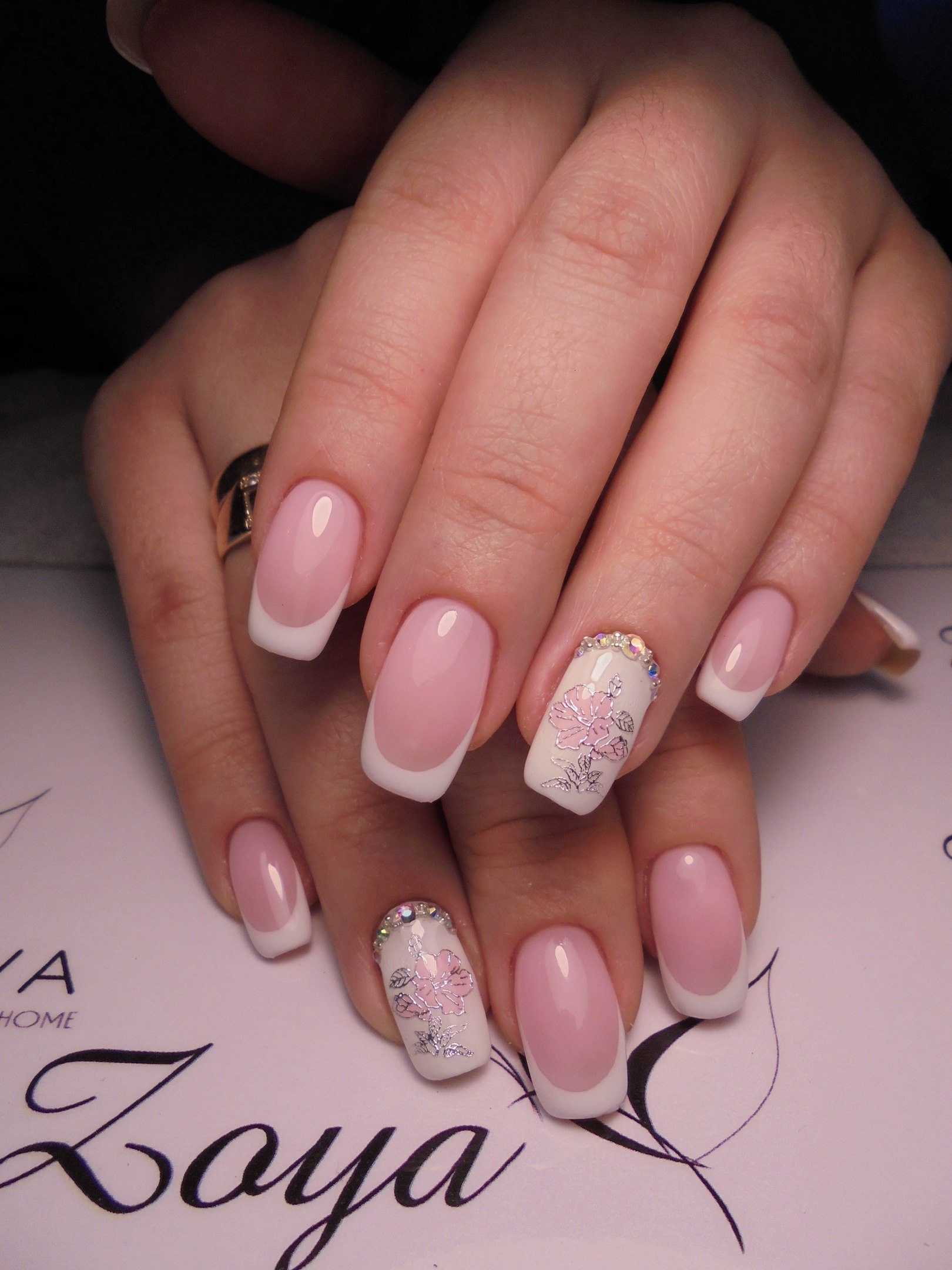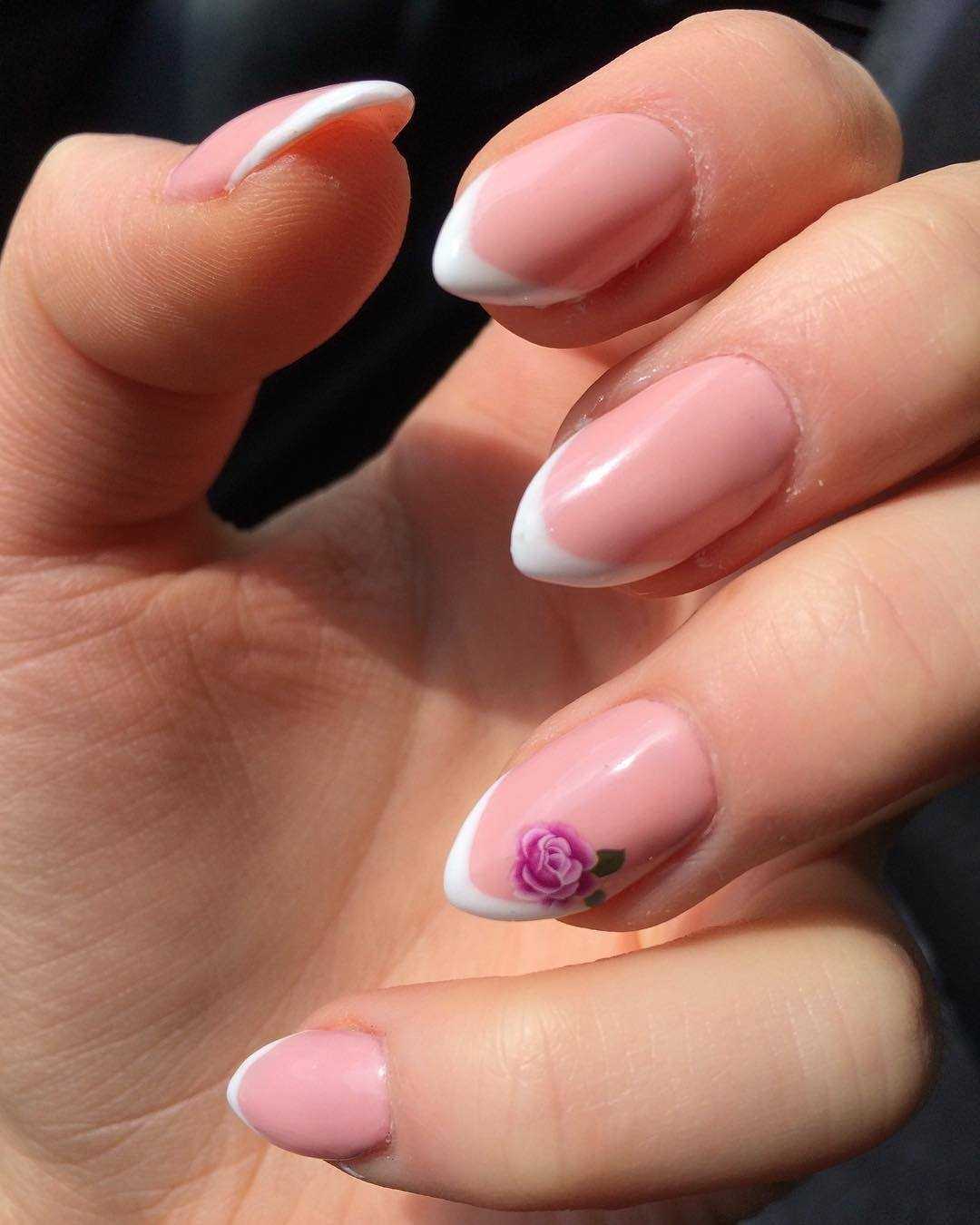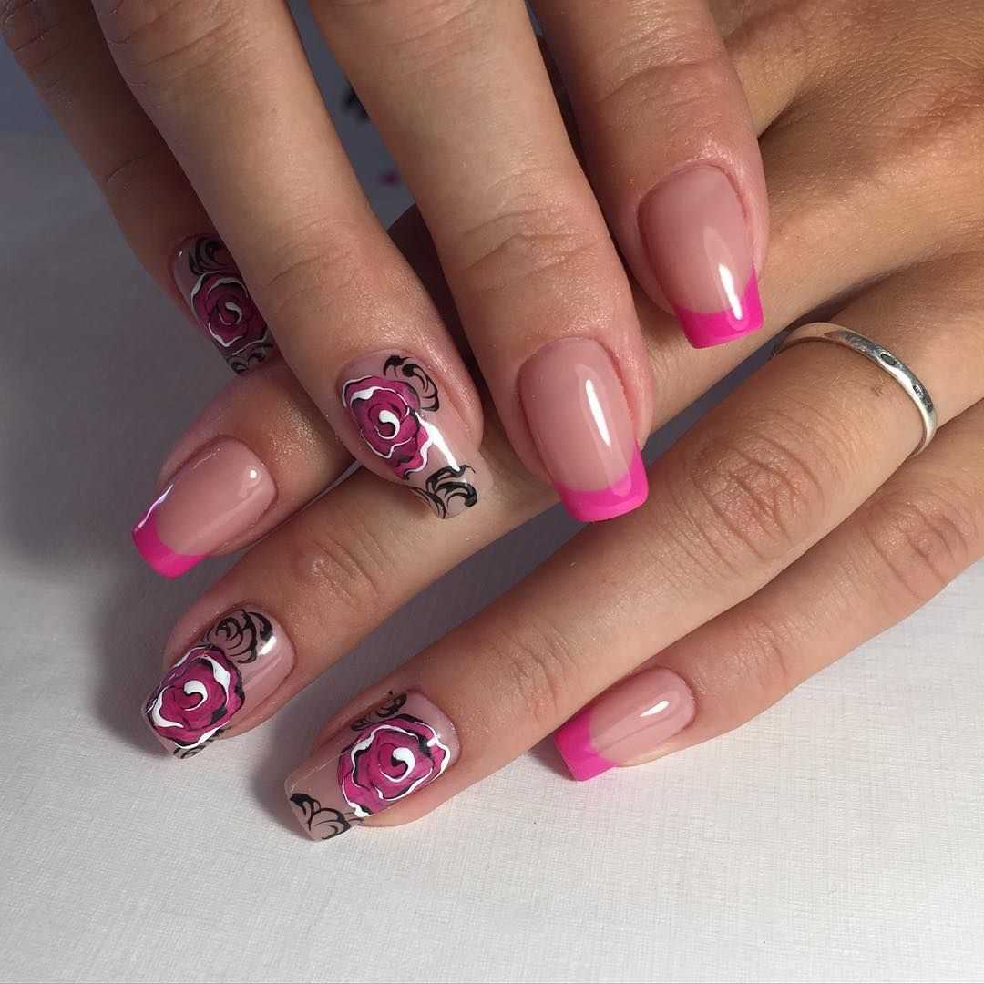- флористика – лучший вариант для оформления френча. Разнообразие цветов огромно, поэтому размещайте на ноготках любые сезонные цветы и другую флористику. Летом это могут быть подсолнухи и ромашки, которые добавят нейл-арту еще большей яркости и контраста, зимой остановите свой выбор на классическом рисунке с розами.