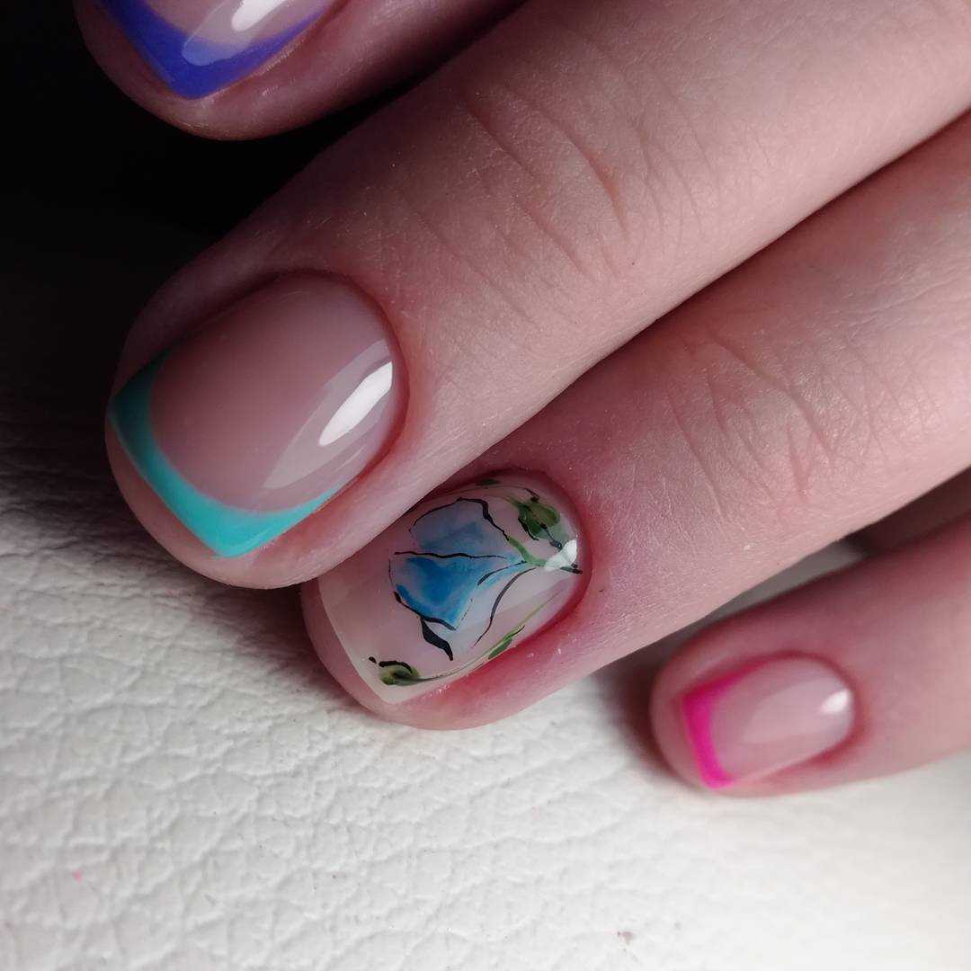 Дружеская компания из нескольких оттенков покрытий, разных техник и цветочных композиций в этом сезоне покорила не одно женское сердце. Смело используйте в одном маникюре яркие лаки, блестящий глиттер в качестве акцента и украшенный распустившимися бутонами розы френч. Оформите дизайн в изысканном минимализме и сделайте один акцентный пальчик ярким, а другой украсьте декором. Прекрасно смотрится на одной руке классический френч с объёмной лепкой и однотонное покрытие. Можно покрасить ноготки в стиле градиент, выполнив переход разными оттенками не на одном ноготке, а на всей руке.