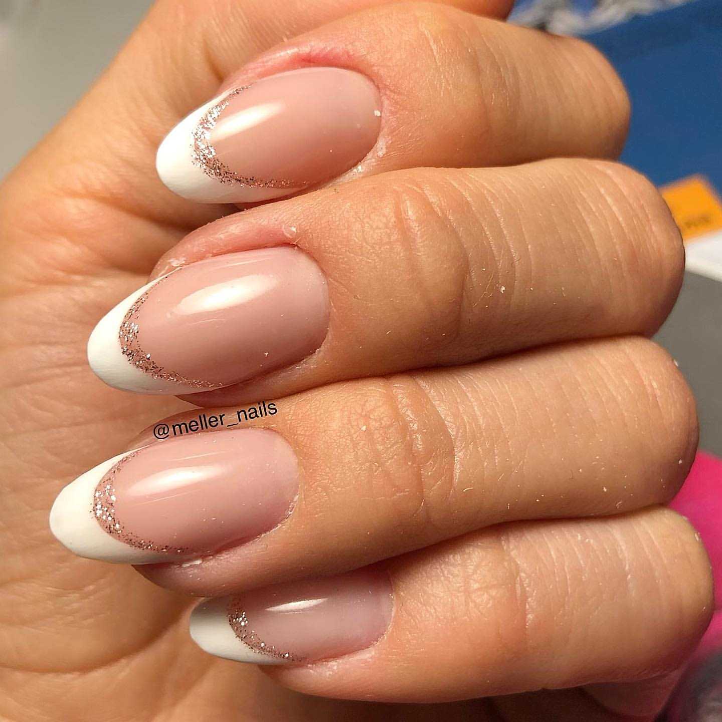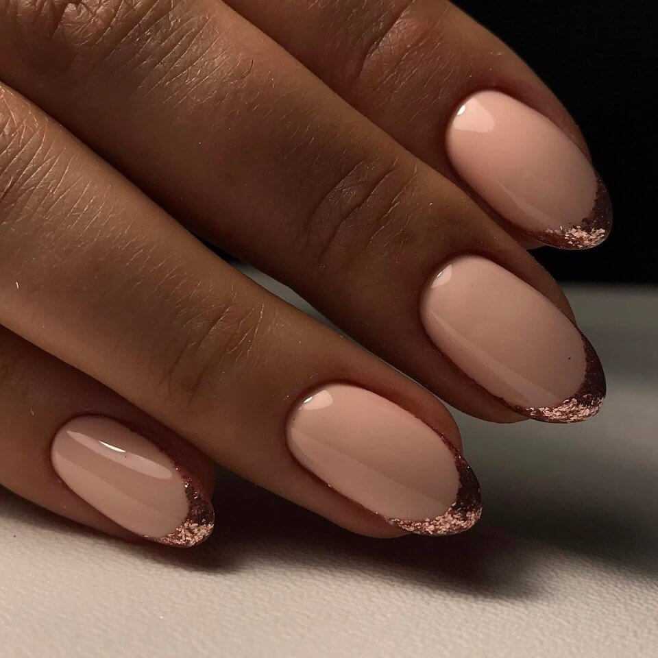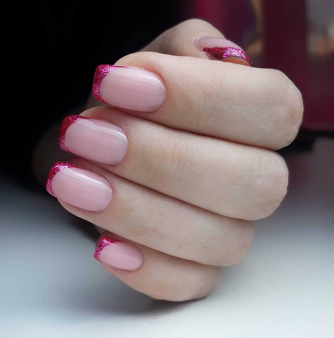 Кто-то может сказать, что нежный френч и блеск глиттера – несовместимые элементы. Но мода диктует свои правила. Различные блески, фольгу, втирки и глиттер современные мастера добавляют даже для создания сдержанного френча. Подведите свободный край не классическим обычным гель-лаком, а глиттером – и вы получите шикарный и в тоже время не вульгарный маникюр. С таким маникюром не стыдно отправиться и в ресторан, и на ответственную встречу. Эффектный способ создать нежный и стильный френч 2020 – выделить глиттером один или два ноготка. Это может быть сплошное покрытие или выполнение какого-нибудь рисунка.