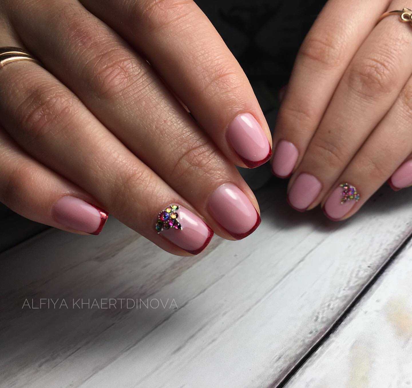 - После обработки кончиков белым цветом, можно по кромке налепить стразы. Если в наличии есть интересный яркий лак, то можно прокрасить тонкую декоративную полоску, как грань перехода между белым и бежевым (розовым);