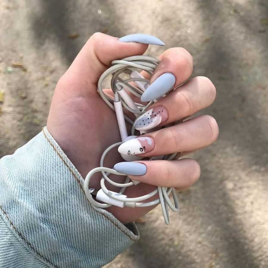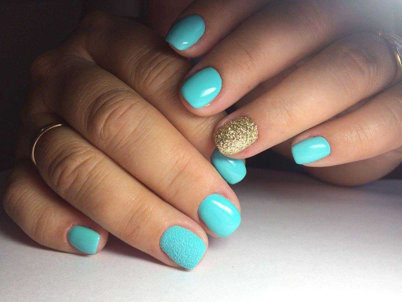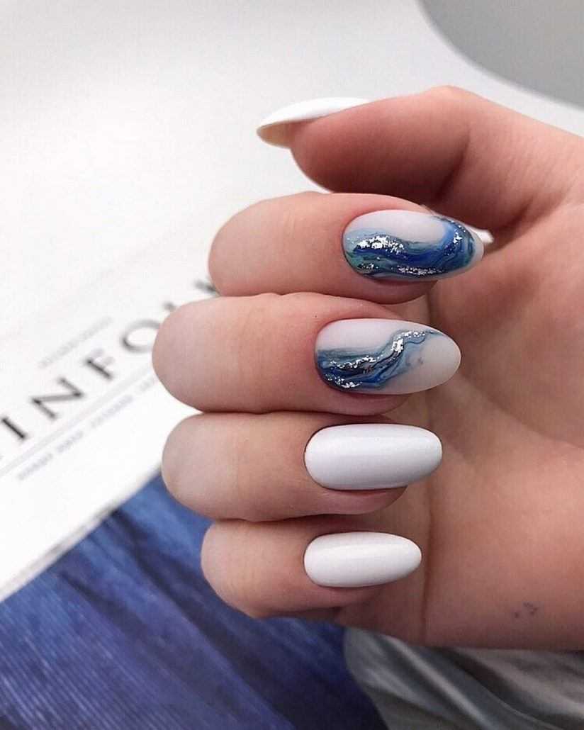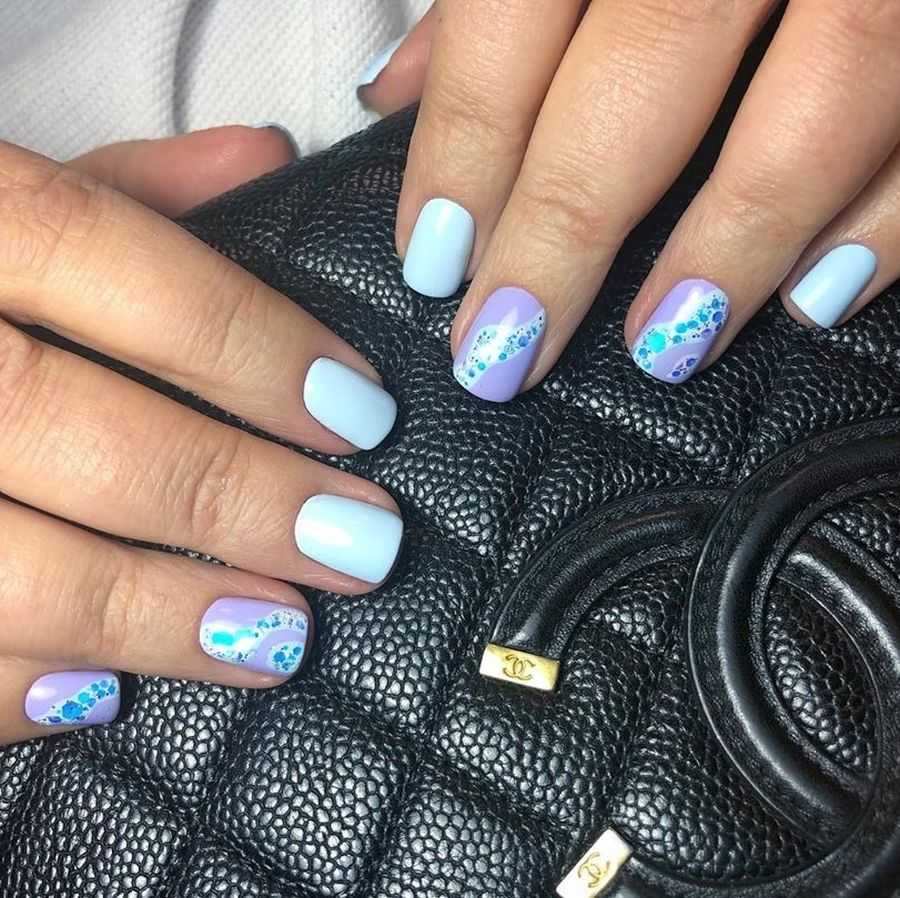 Нарисовать дымку или морскую волну не составляет труда. Для этого можно использовать аэрограф или маникюрную кисть. Красиво выглядят нейл-арты, где помимо голубого оттенка еще присутствует золотой или серебряный глиттер. Подобные минималистичные нейл-арты – тренд летнего сезона 2020. Он не доставит проблем во время отдыха на море, будет отлично смотреться как на пляже, так и на променаде.