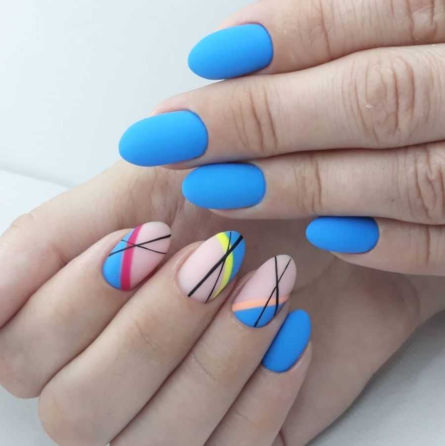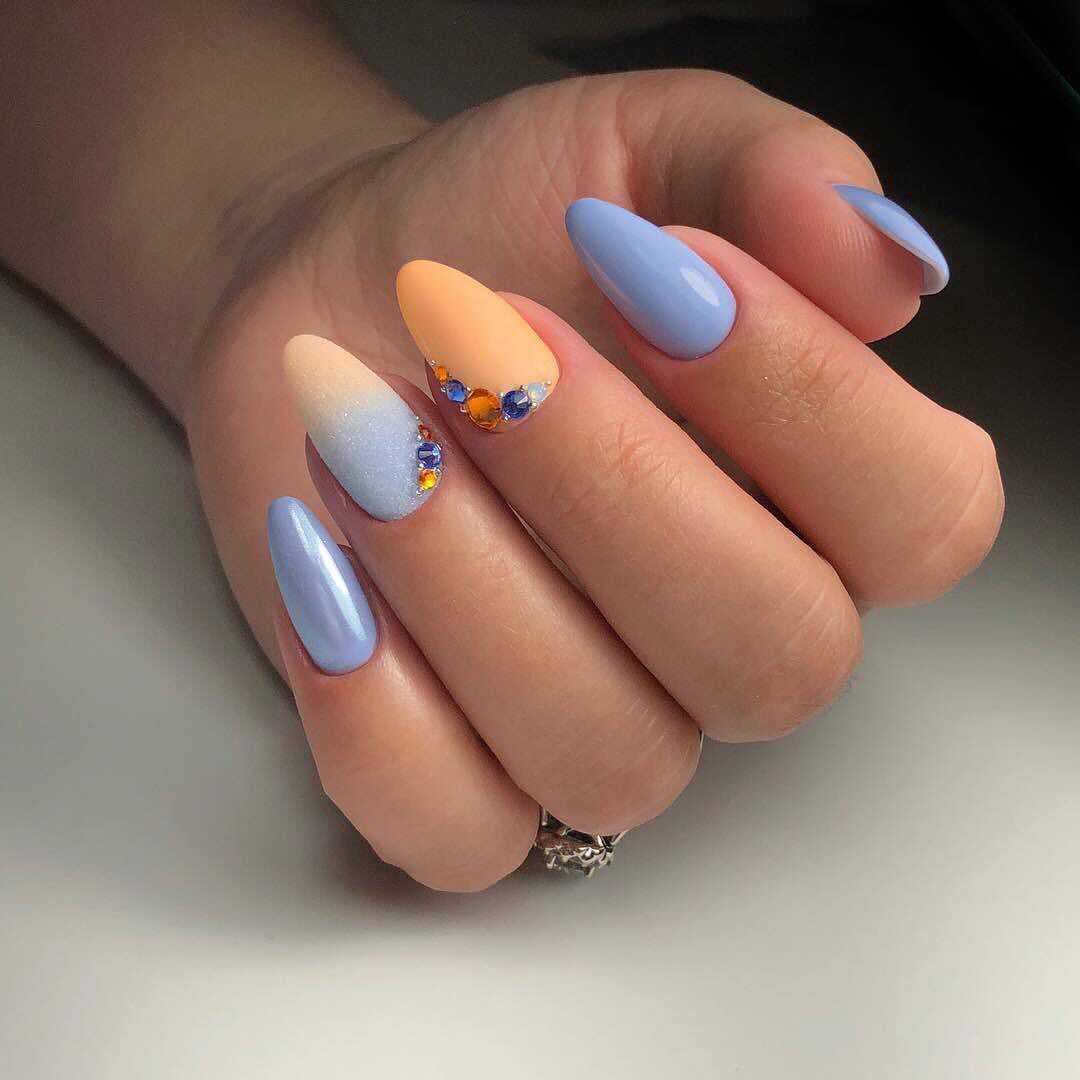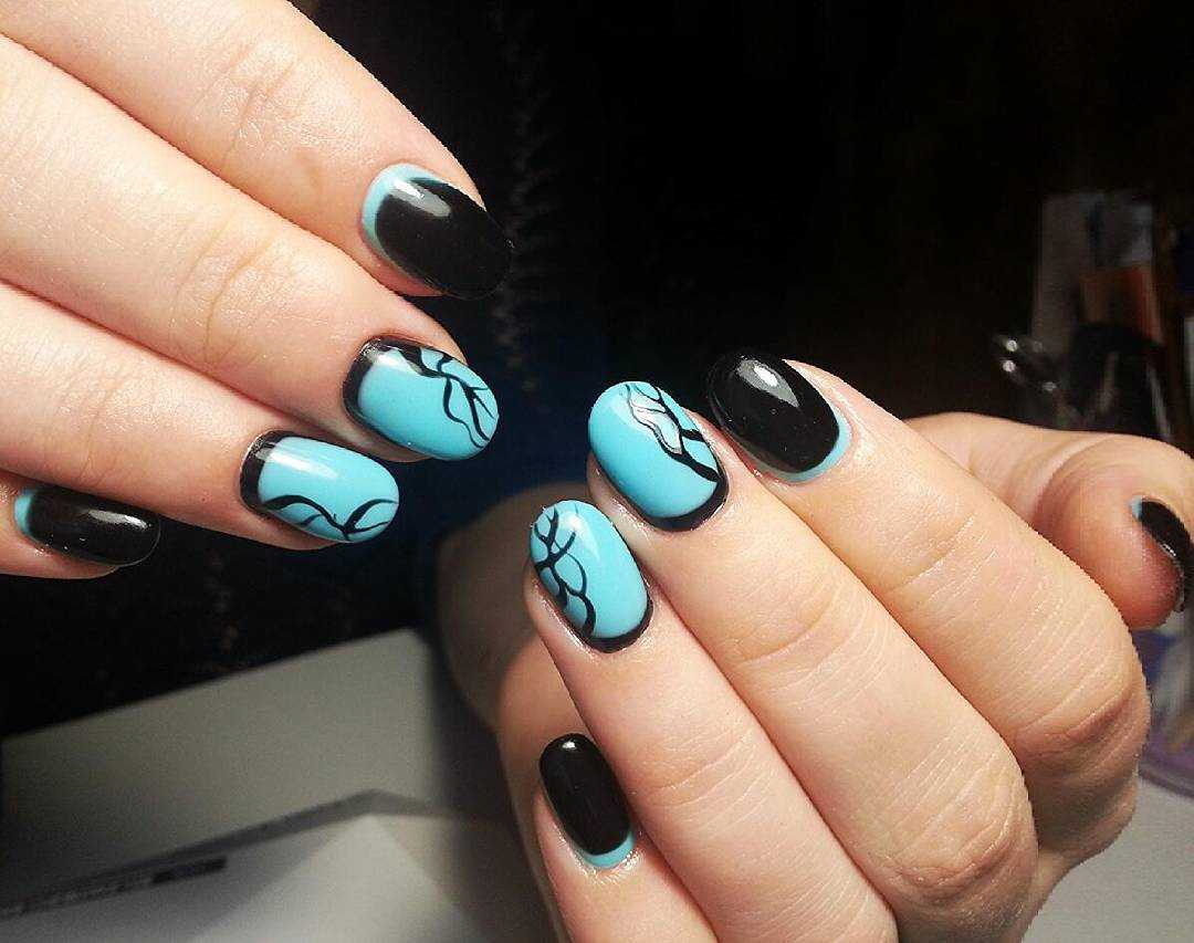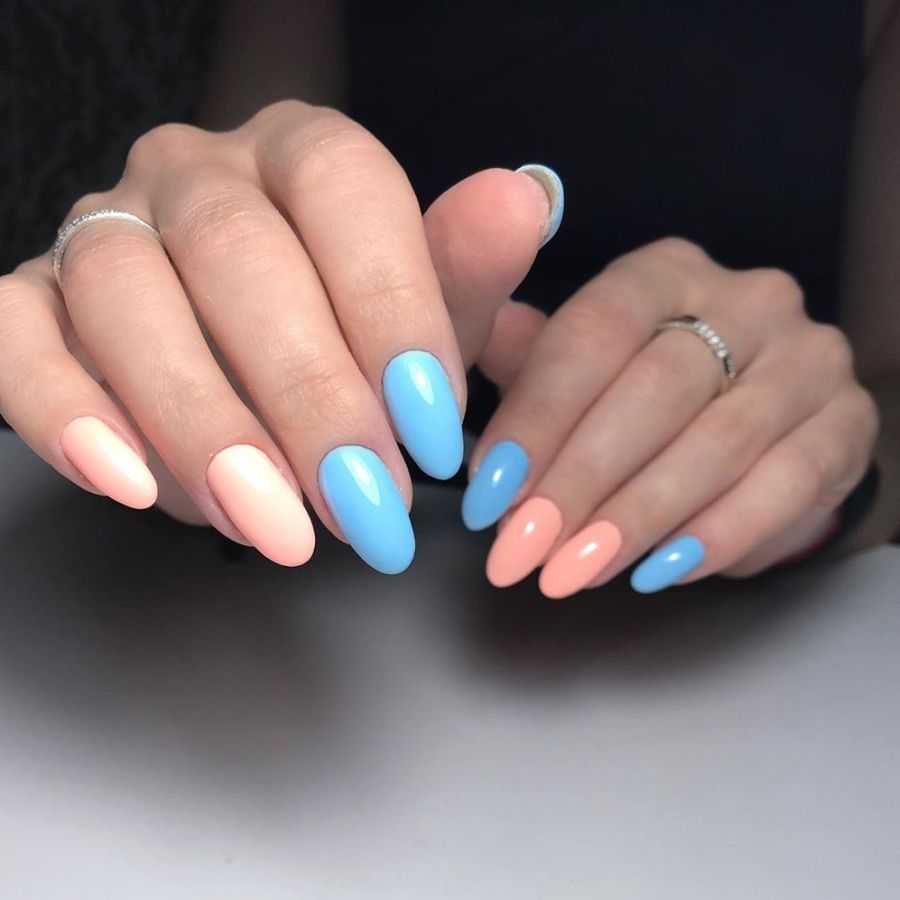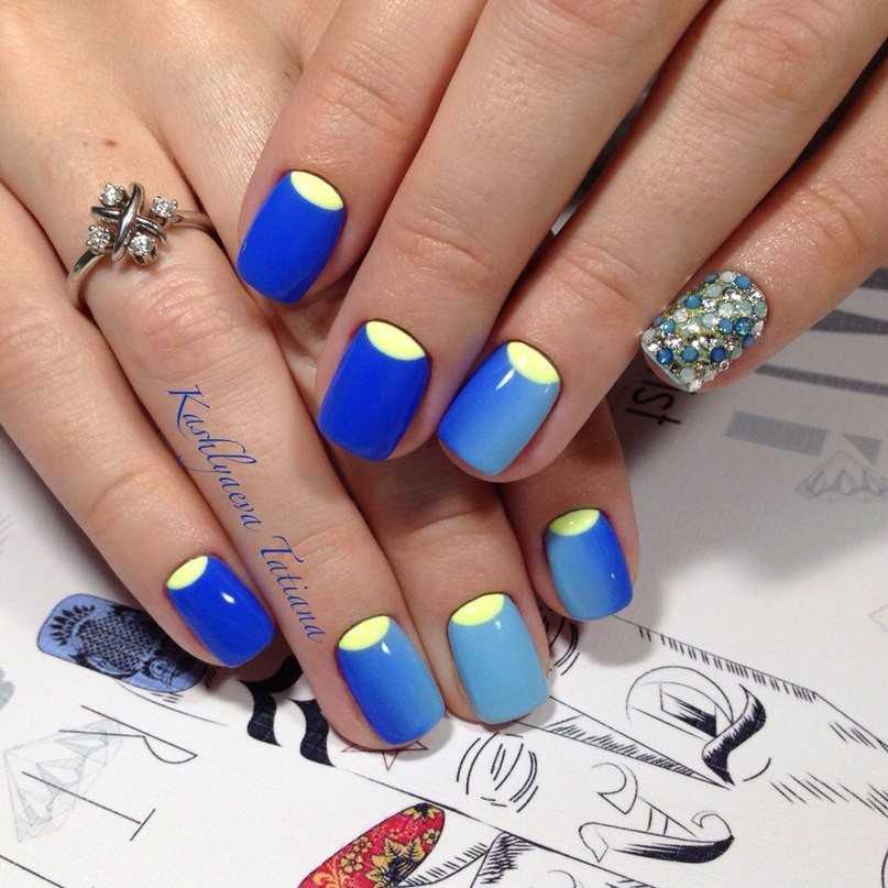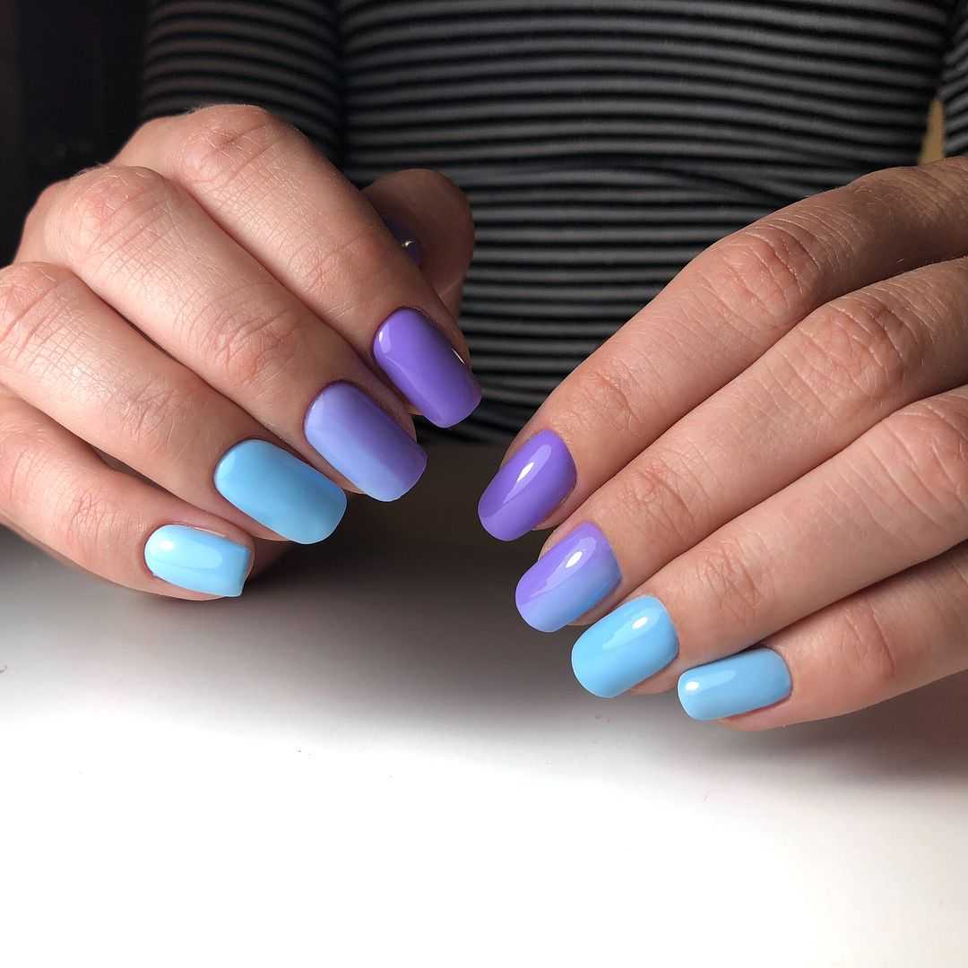 Красиво выглядит разноцветный маникюр в голубом цвете. Для этого выберите несколько оттенков голубого, темнее и светлее и окрасьте каждый из ноготков отдельным цветом. Градиентный маникюр шикарно выглядит в сочетании с белым цветом. Переход цвета получается мягким и практически незаметным. Не рекомендуется выполнять градиентный маникюр с темными оттенками, например, черным. Выполнить плавный переход вряд ли получится. В качестве альтернативы черному цвету выберите темно-синий оттенок.