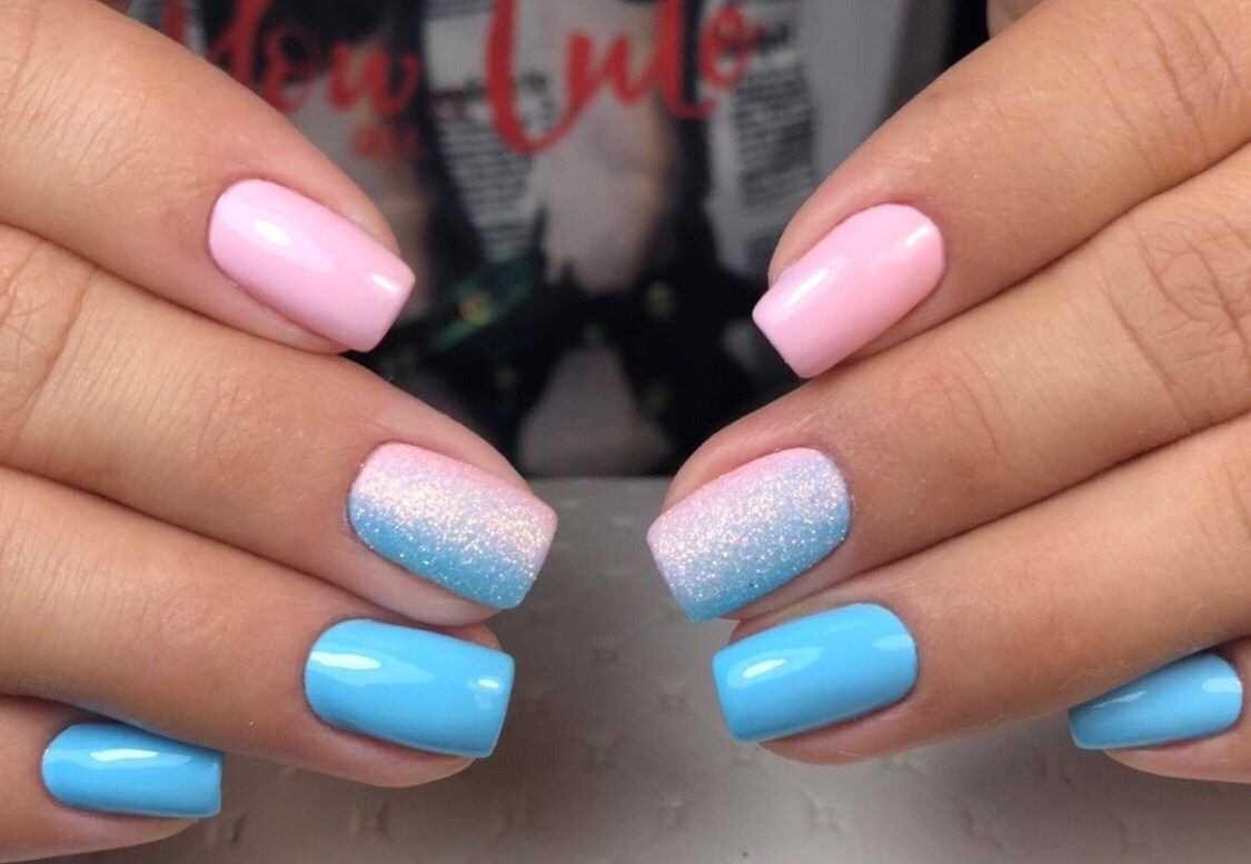 Дуэт розового и голубого – совершенное сочетание юности и женственности. Ноготки, оформленные подобными лаками, смотрятся одновременно свежо и стильно, что не только гарантирует обладательнице такого маникюра наличие бодрого настроения, но и продемонстрирует окружающим её уверенность в себе. Розовые цветочки на голубом фоне, розовая или, наоборот, голубая волнистая, треугольная или косая улыбка, полосочки и точки – вариаций маникюра с этими оттенками не счесть