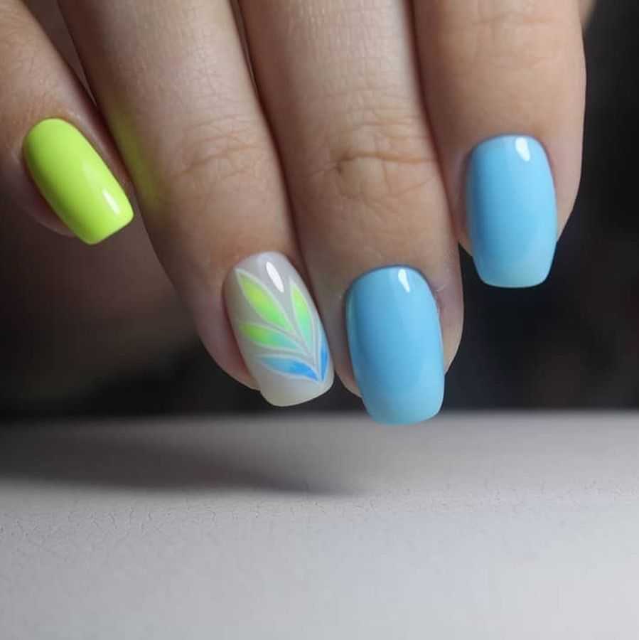Ещё одним актуальным решением для создания яркого и сочного маникюра является использование в дизайне зелёного и жёлтого. Такое сочетание всегда смотрится очень выразительно и станет прекрасным дополнением лёгкого весеннего или летнего образа