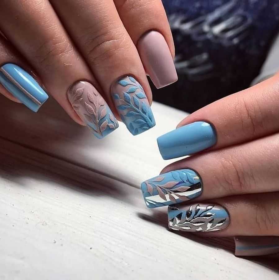 Дизайн ноготков с использованием серебристого и голубого лака можно назвать «маникюром Снежной Королевы». Нежность голубого и холодные металлические серебристые отблески смотрятся на ноготках просто потрясающе. Вы можете оформлять подобными оттенками френч или лунный маникюр, красиво выделяя линию улыбки или лунулу у основания серебристыми нотками, либо дополнять прозрачное основание голубого френча блестящими полосками или рисунками. Фантазия безгранична! Также шикарно смотрится акцентный ноготок, выделенный серебристым глиттером или блестящие дополнения в виде кусочков фольги, узоры, оформленные блестящими камифубуки и многие другие идеи, способные подчеркнуть волшебство оттенков.