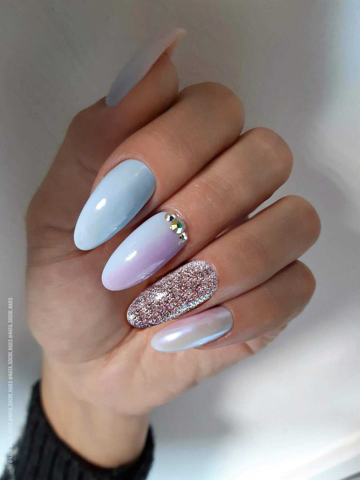 Летний период 2020 – это прекрасная возможность создать на ноготках одну из вариаций маникюра с втиркой. Мелкая акриловая пудра способна невероятным образом создать на ноготках любого цвета завораживающее сверкающее покрытие. Голубой лак в этом примере смотрится в лучах летнего солнца просто невероятно красиво. Голография, перламутровое сияние или зеркальный блеск украсит ваш маникюр – решать только вам. Втирка смотрится очень эффектно и в большинстве вариаций не нуждается в дополнительном сложном декоре. Но, если очень хочется, можно украсить несколькими камнями или рисунком несколько пальчиков.