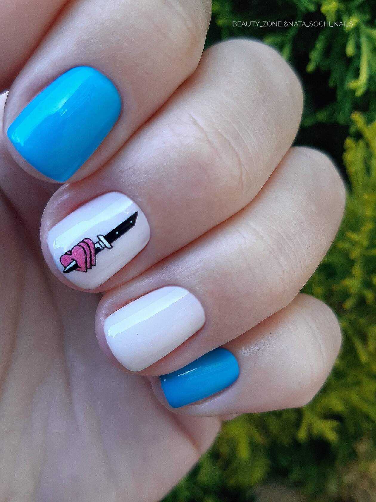 Что касательно узоров, то здесь ориентируемся на вкус и возраст представительниц женского пола- от мультяшных персонажей до прагматичной геометрии. Если тематика мероприятия позволяет, можно сочетать небесный френч с желтым или розовым цветами для создания радужного настроения.