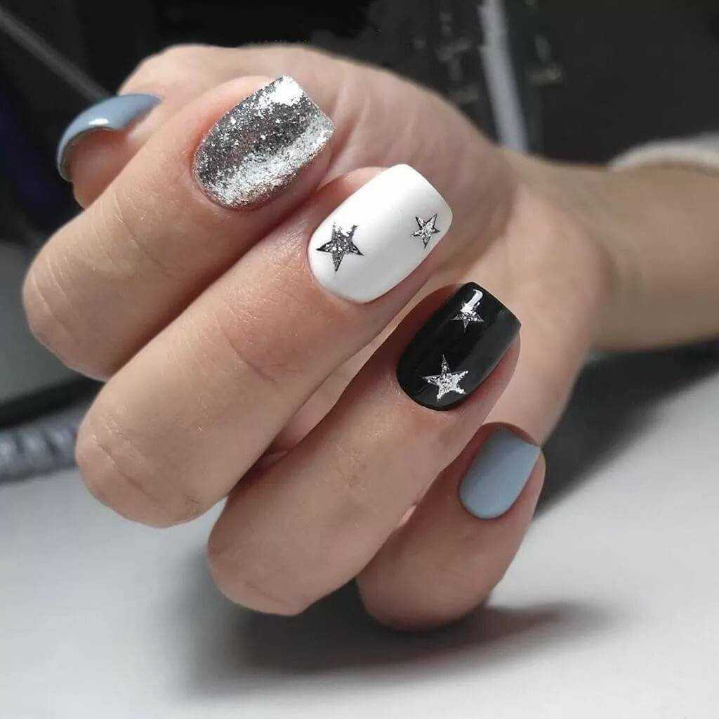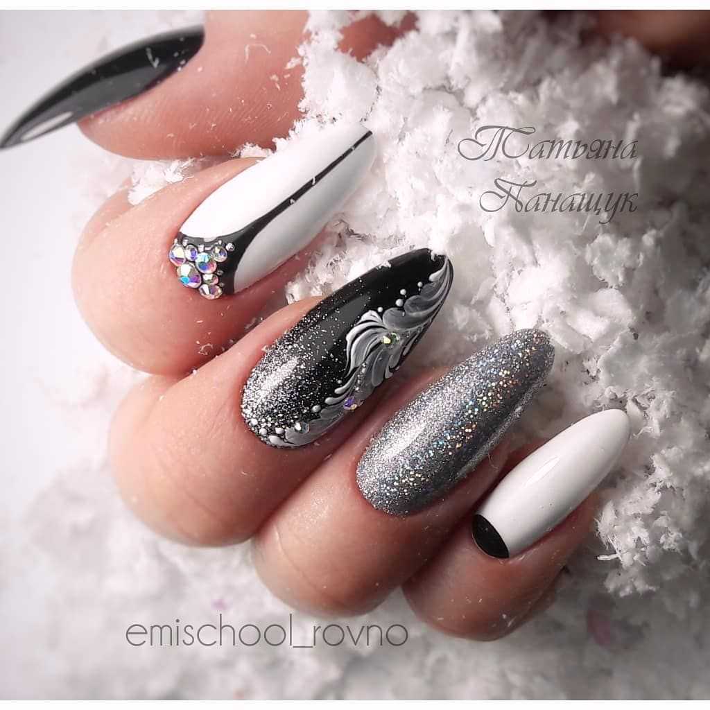 #3 Черно-белый маникюр с блестками