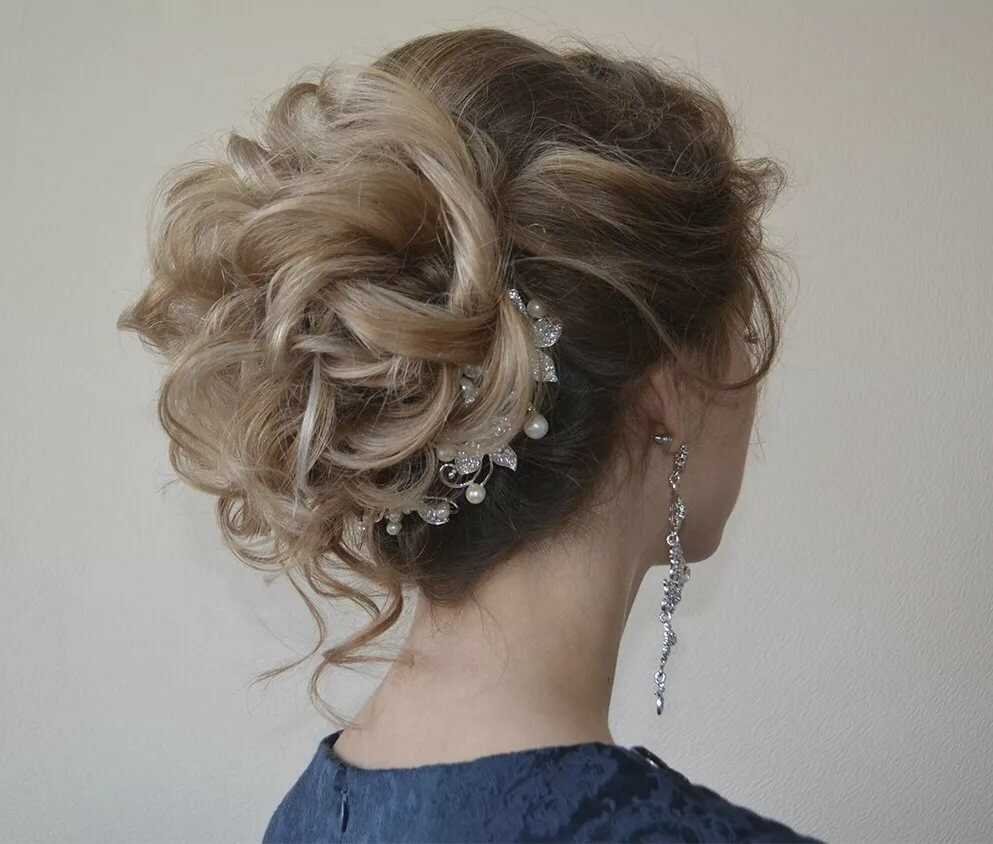 - кудрявые волосы отлично смотрятся в виде слегка растрепанного небрежного пучка. Кстати, этот вариант должен понравиться девушкам, которые следят за последними модными тенденциями: тщательные, аккуратные свадебные укладки уже давно утратили свою актуальность. Сделать такой пучок очень просто: сделайте хвост и оберните локоны вокруг его основания. Осталось зафиксировать прическу при помощи лака и невидимок либо шпилек с маленькими жемчужинами или стразами;