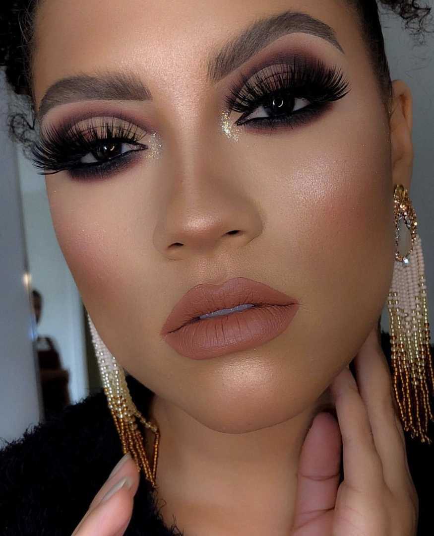Следует быть осторожными при выборе мерцающих теней. Напомним, что в тренде золотистые, бронзовые и терракотовые тона. Серебристая и голубая гамма нежелательна в новогоднем макияже, ведь Земляной Собаке по нраву теплые оттенки. Дополнить макияж с блестками сумеют как нюдовые помады, так и насыщенный lipstick с матовым эффектом.