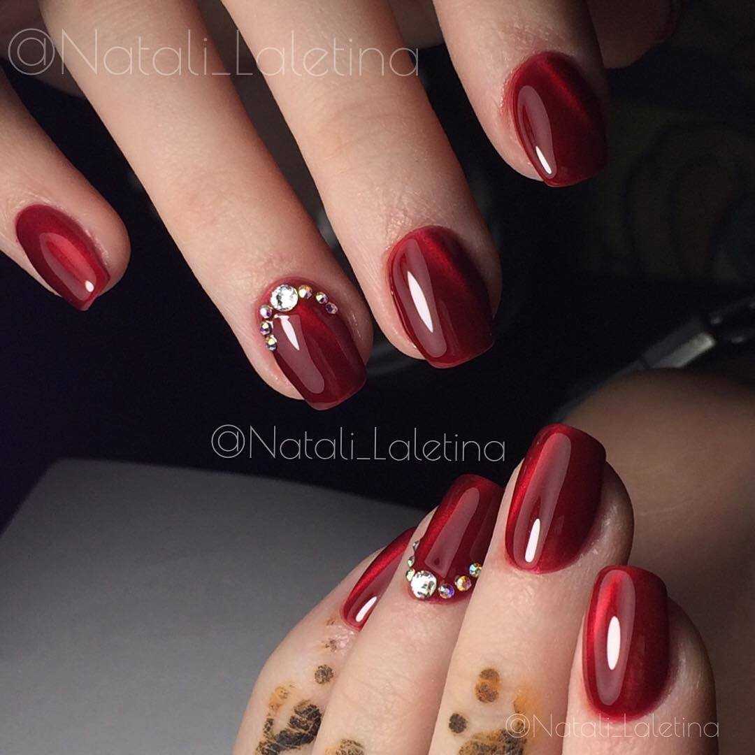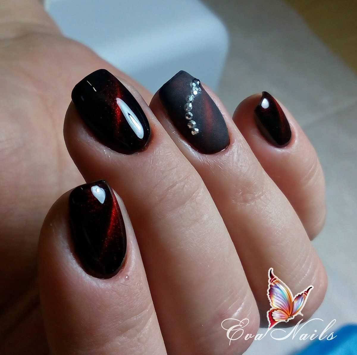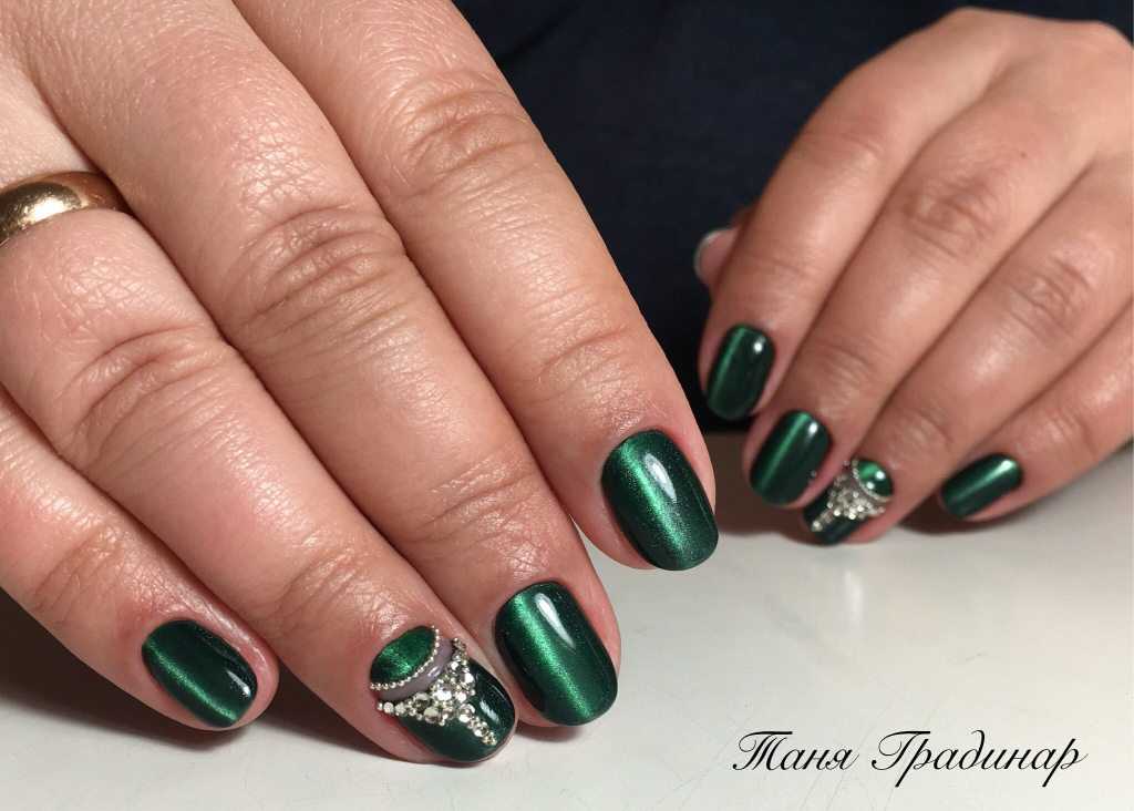 Маникюр «кошачий глаз» настолько благороден и привлекателен, что практически не нуждается в дополнительных украшениях. Исключение составляют только сверкающие стразы, которые в небольшом количестве можно расположить на краю или основанию ногтей
