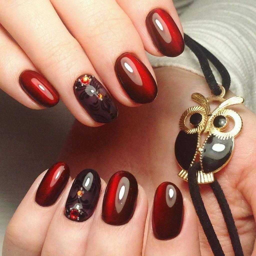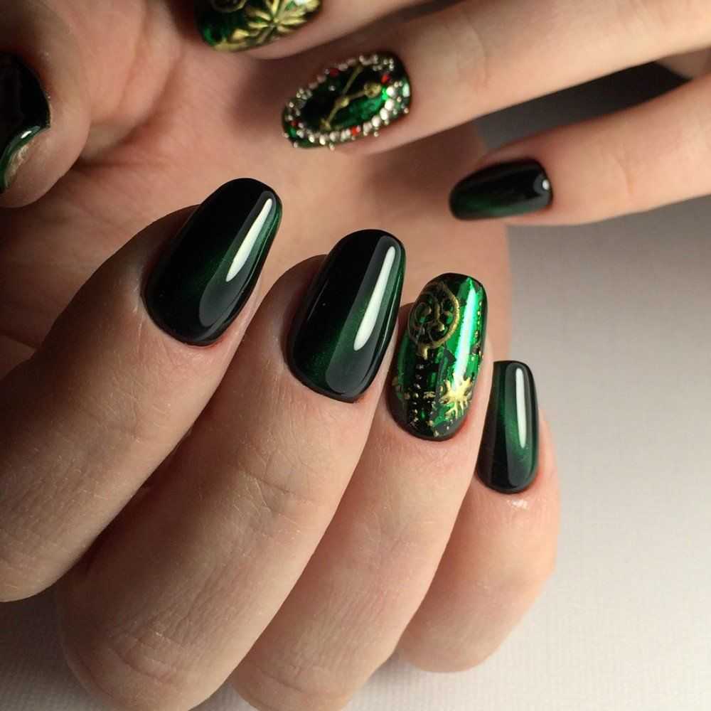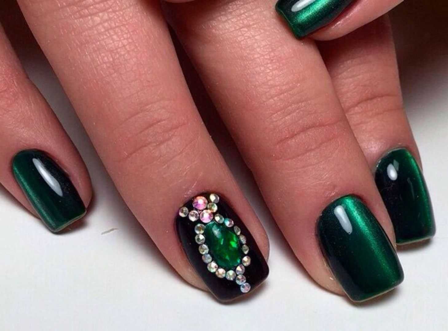 Маникюр «кошачий глаз» настолько благороден и привлекателен, что практически не нуждается в дополнительных украшениях. Исключение составляют только сверкающие стразы, которые в небольшом количестве можно расположить на краю или основанию ногтей