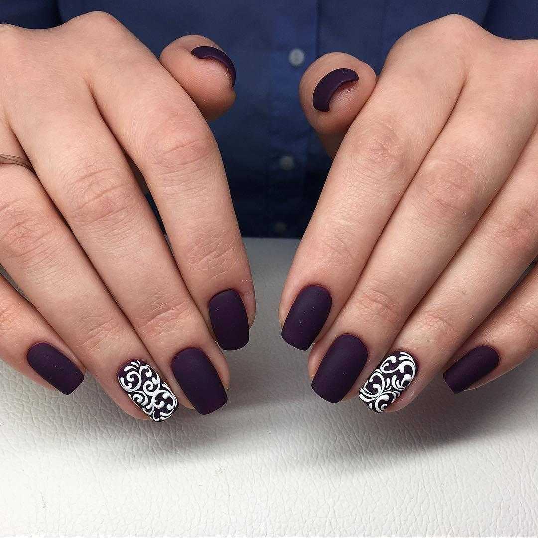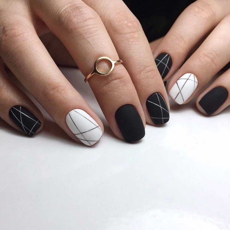 Для делового матового маникюра используйте голубой, серо-голубой, пудровый, бежевый оттенок, украсив 1-2 ноготка лаконичным рисунком с геометрией, узором в стиле оригами, минимализм. Интересно и строго выглядит маникюр в черно-белых тонах, где черный используется для изображения узоров в хаотичном порядке.