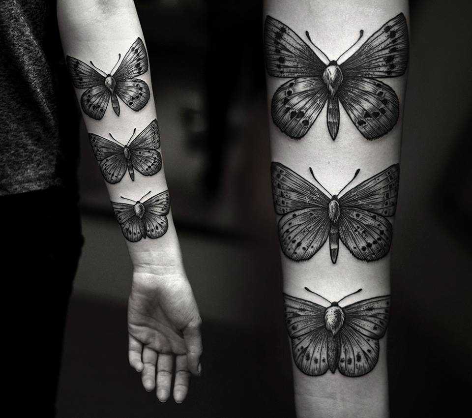 Бабочки являются одними из наиболее предпочтительных идей татуировки для девочек. Они, как правило, имеют дизайн, который почти похож на цветы, но они будут более подробными. Вы можете иметь набор бабочек для кожи вокруг стороне руки, или вы можете иметь одну большую бабочку на запястье.