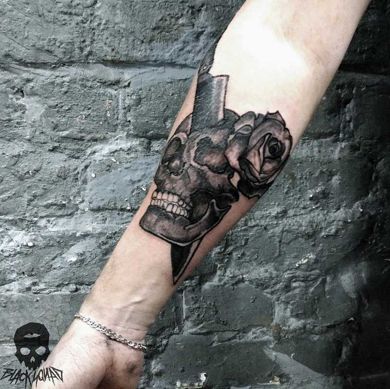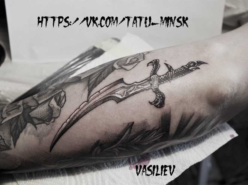 запястье. Изображение кинжала на этом месте выглядит эстетично и тонко. При этом лучше смотрятся детализированные эскизы;
