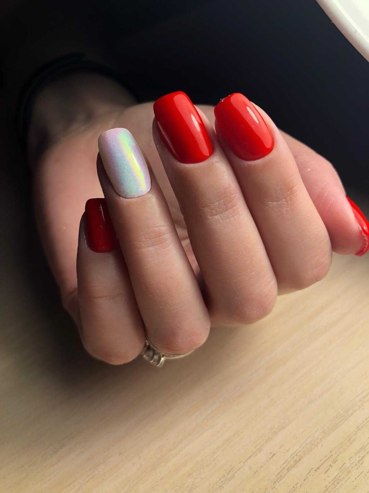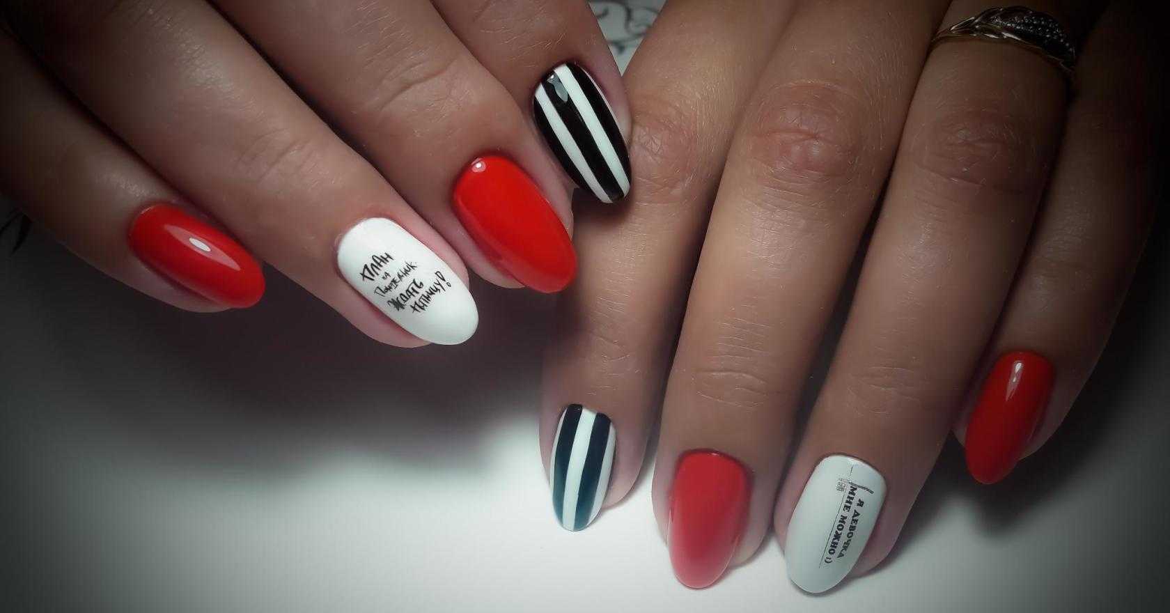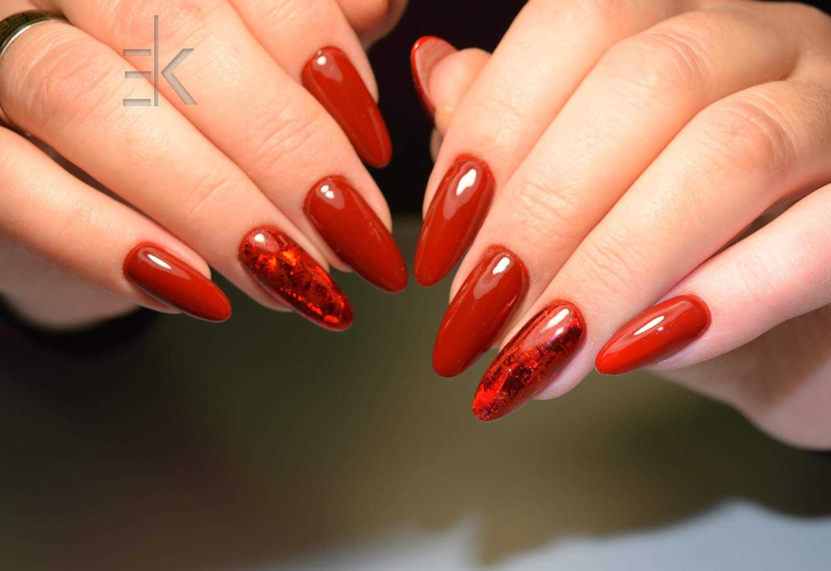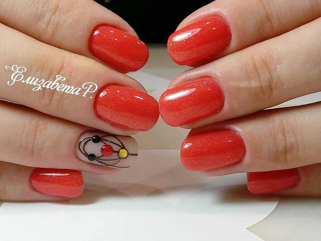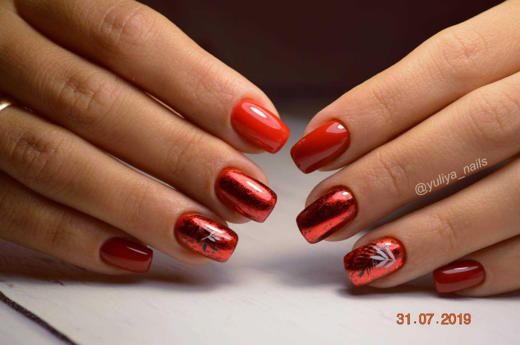 Сегодня красный маникюр – это десятки интересных нейл-артов. Самый популярный и простой вариант – однотонное покрытие в алом, вишневом, баклажанном цвете, украшенный стразами и бульонками в прикорневой зоне. Также шикарно выглядят контрастные сочетания красного цвета с белым, черным, синим.