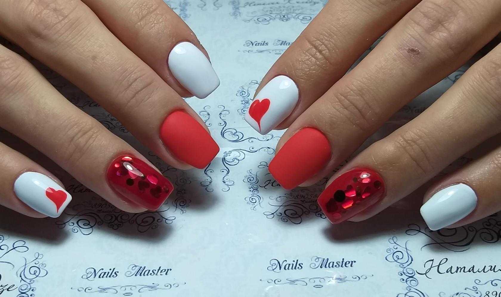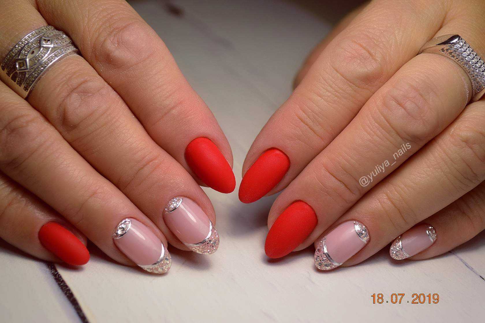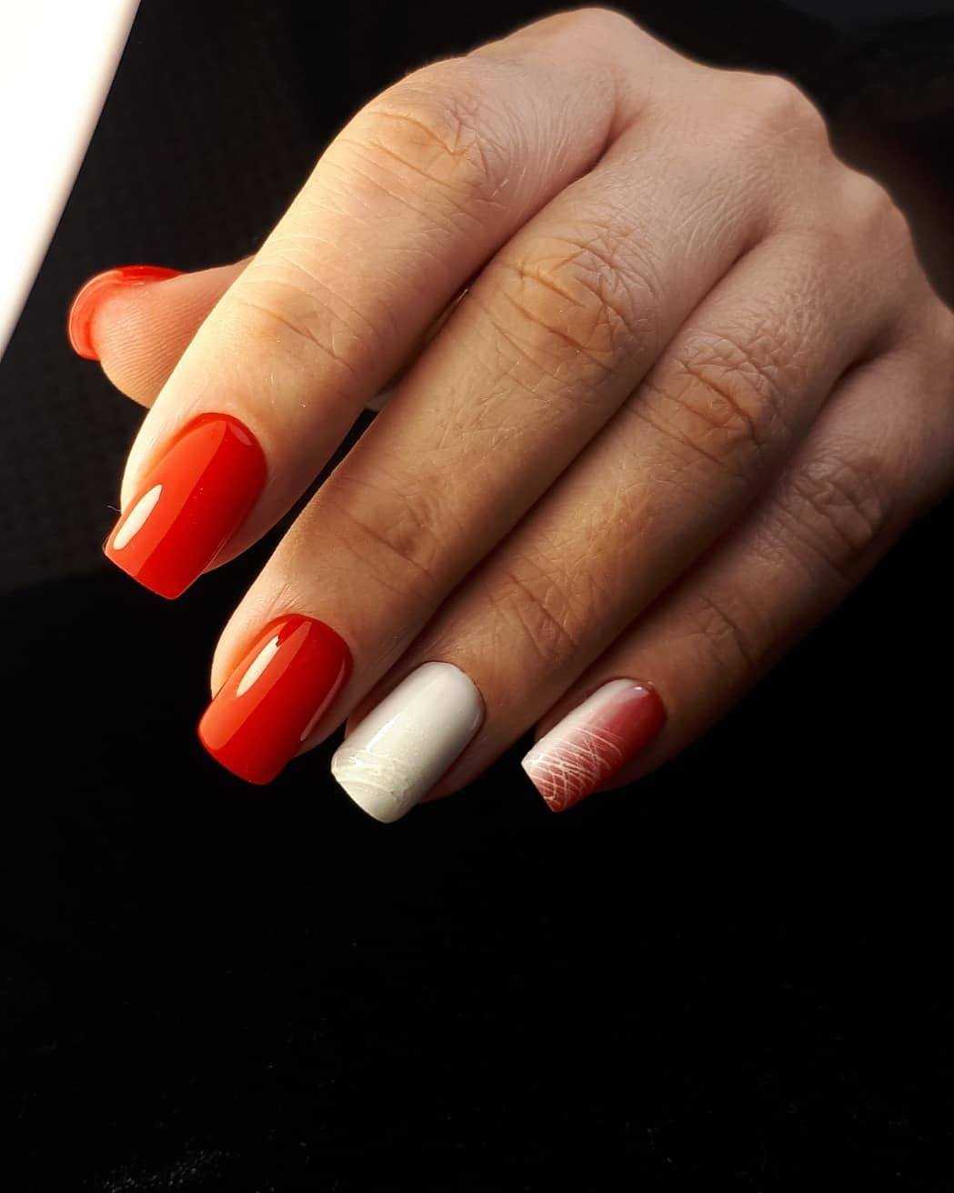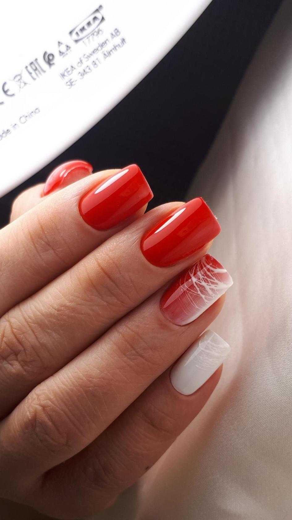 Сегодня красный маникюр – это десятки интересных нейл-артов. Самый популярный и простой вариант – однотонное покрытие в алом, вишневом, баклажанном цвете, украшенный стразами и бульонками в прикорневой зоне. Также шикарно выглядят контрастные сочетания красного цвета с белым, черным, синим.
