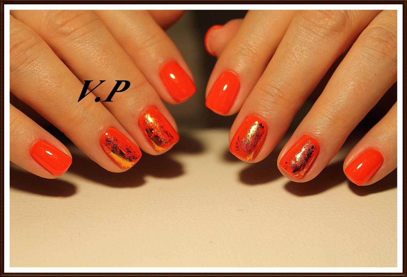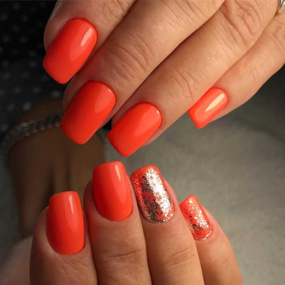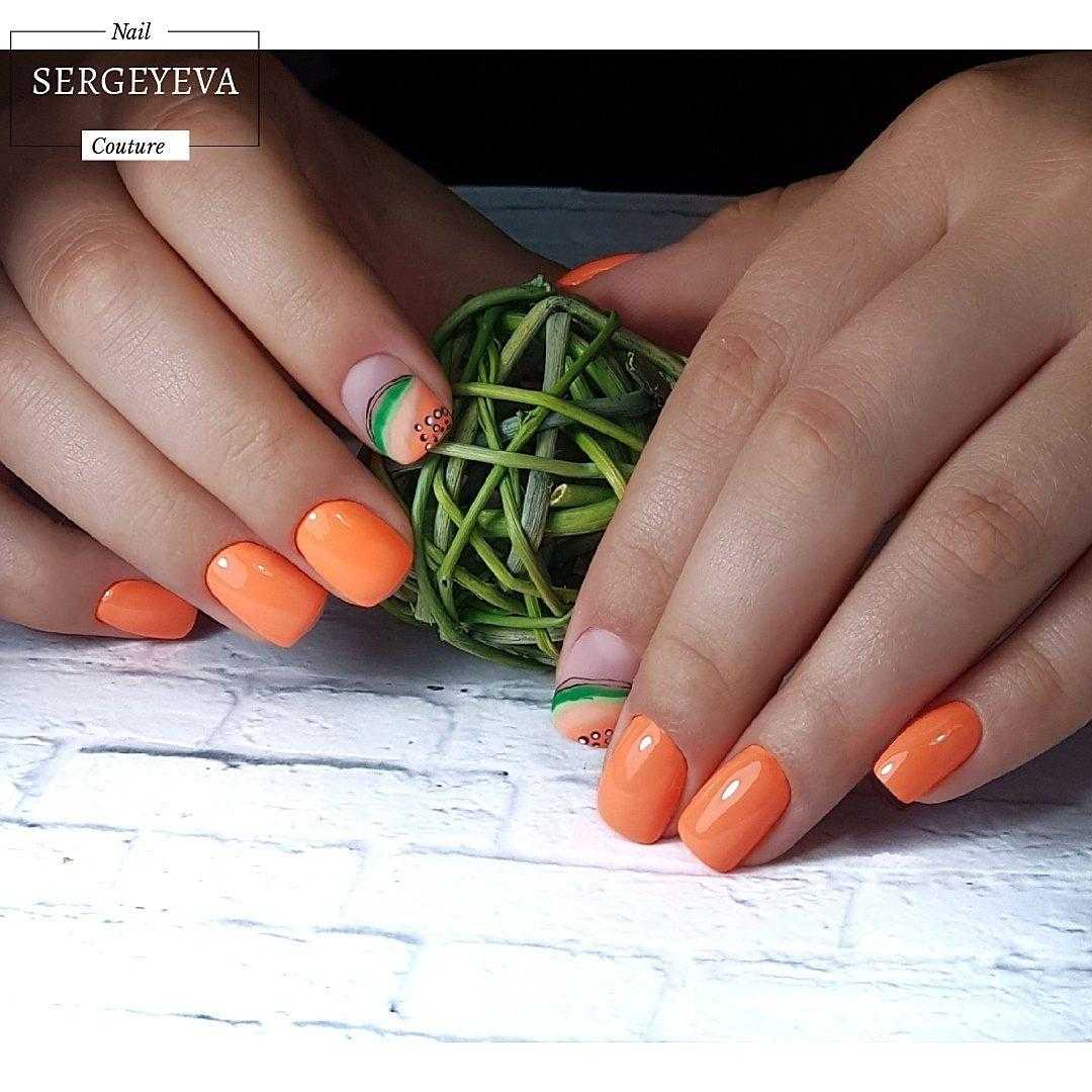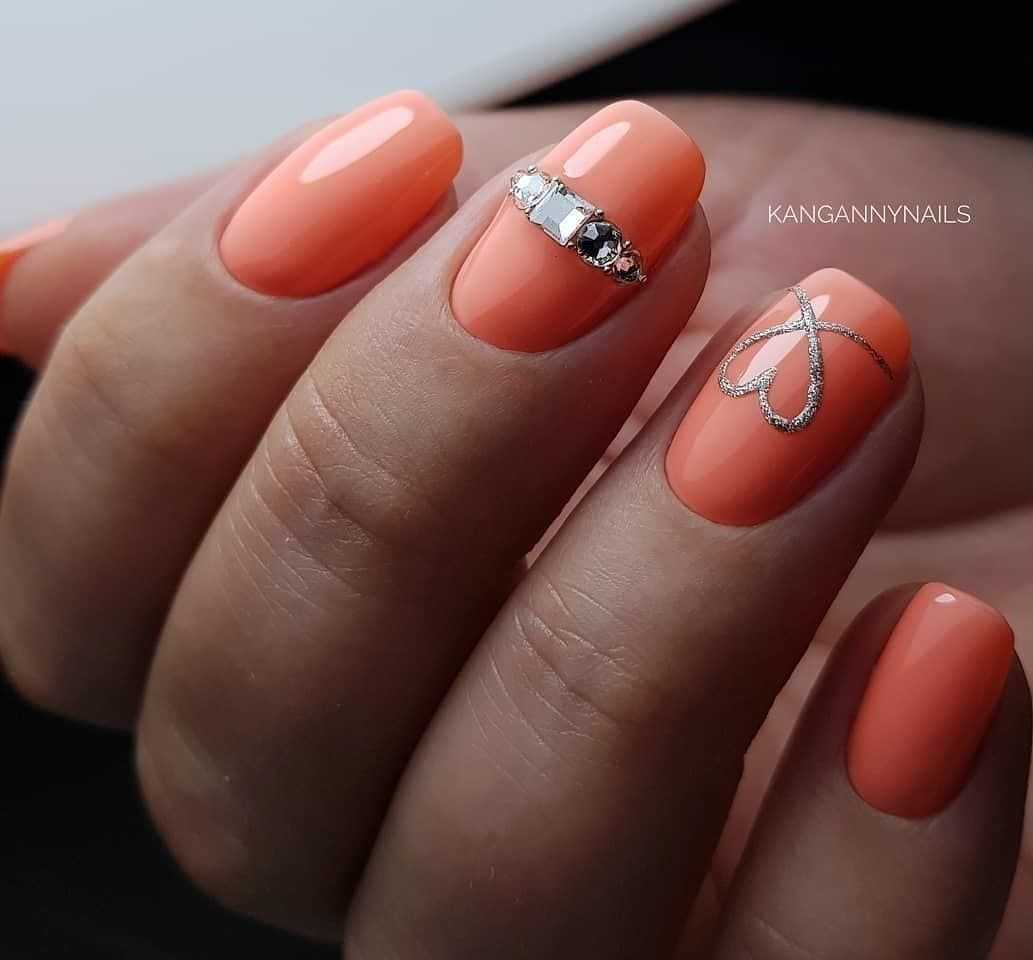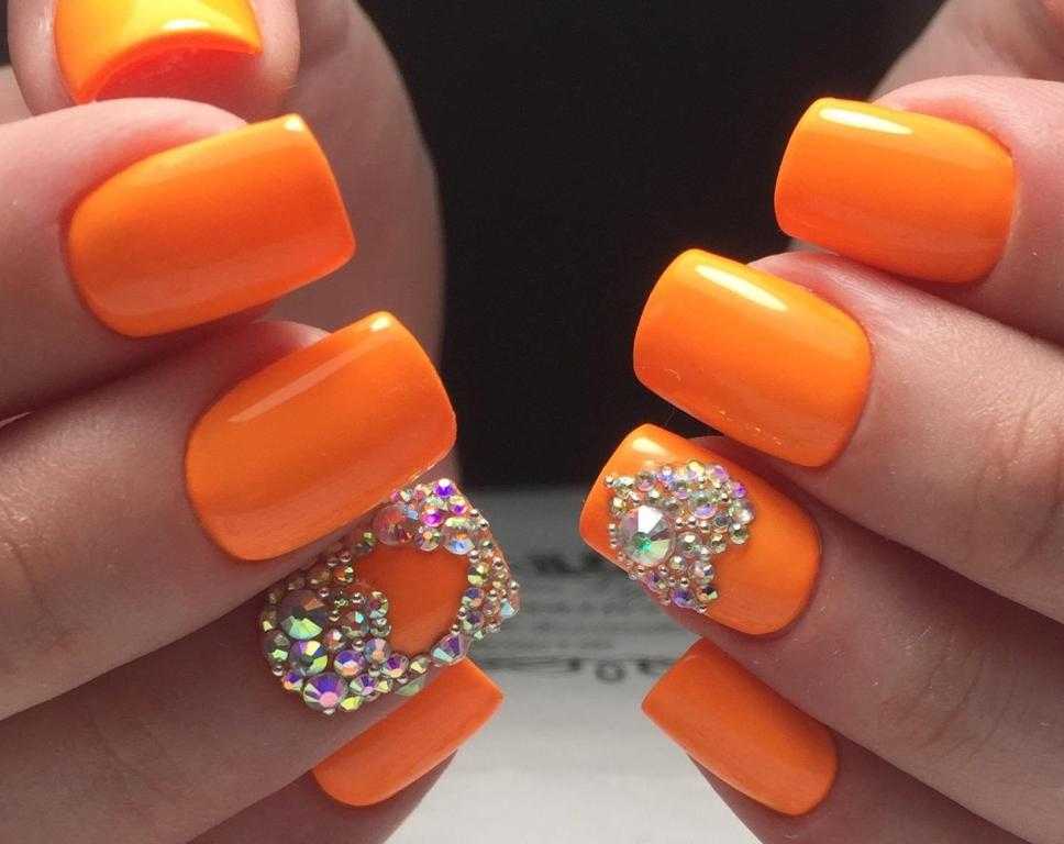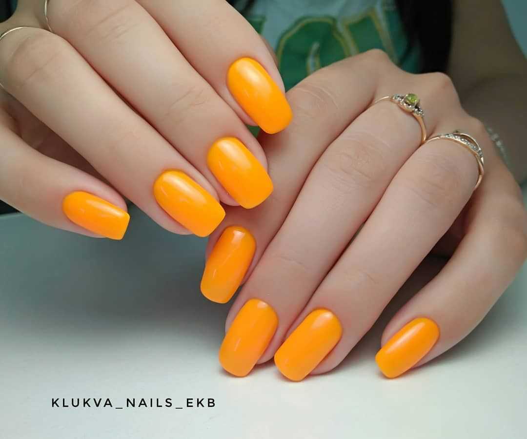 Обладательницам и любительницам коротких ногтевых пластин, придётся по вкусу маникюр в оранжевом цвете. С таким покрытием ноготки будут смотреться объёмнее и насыщенней