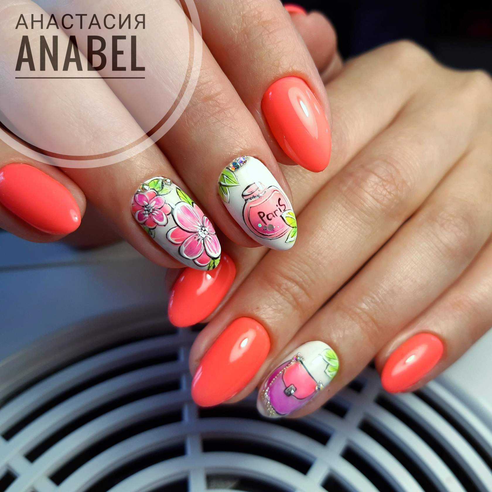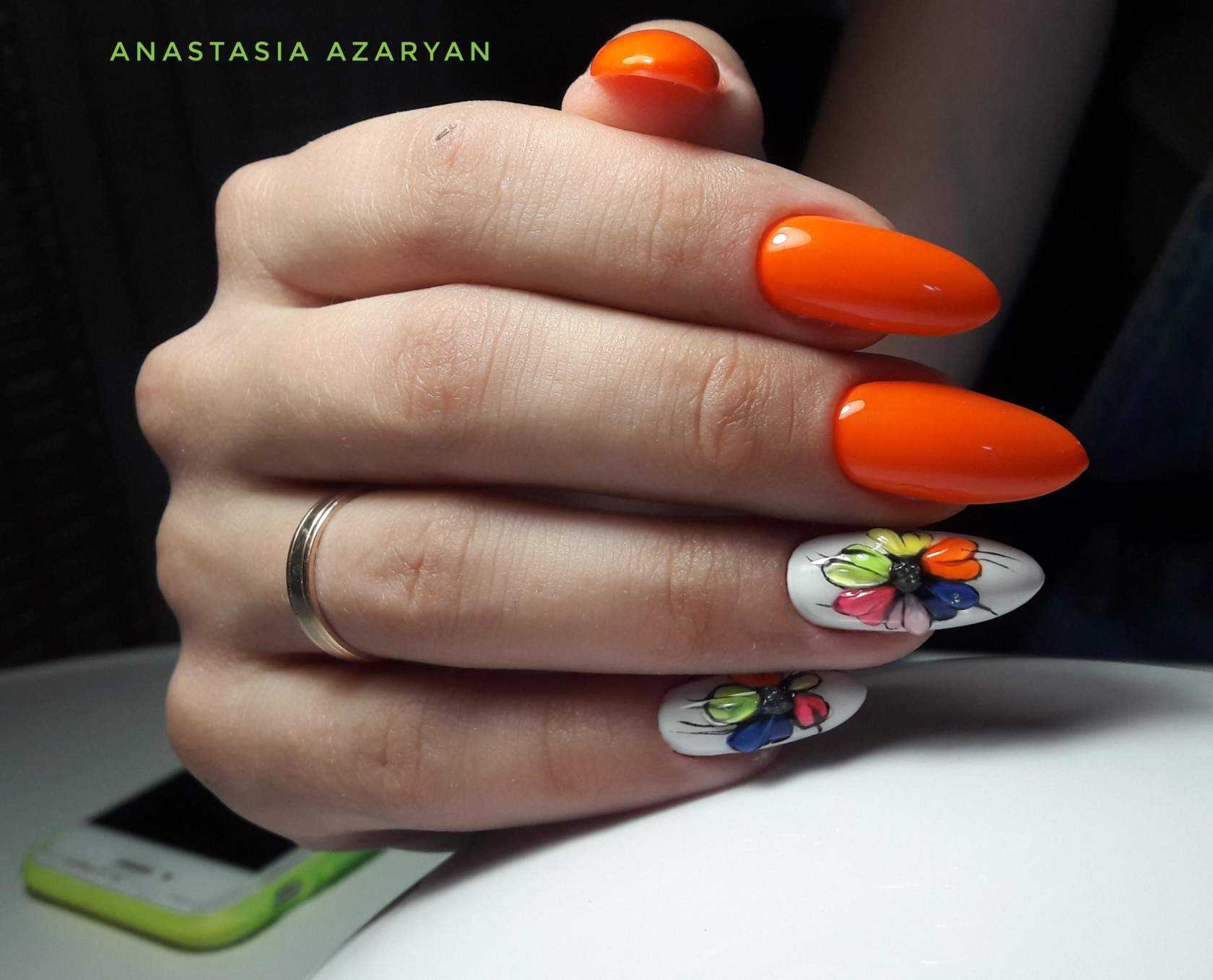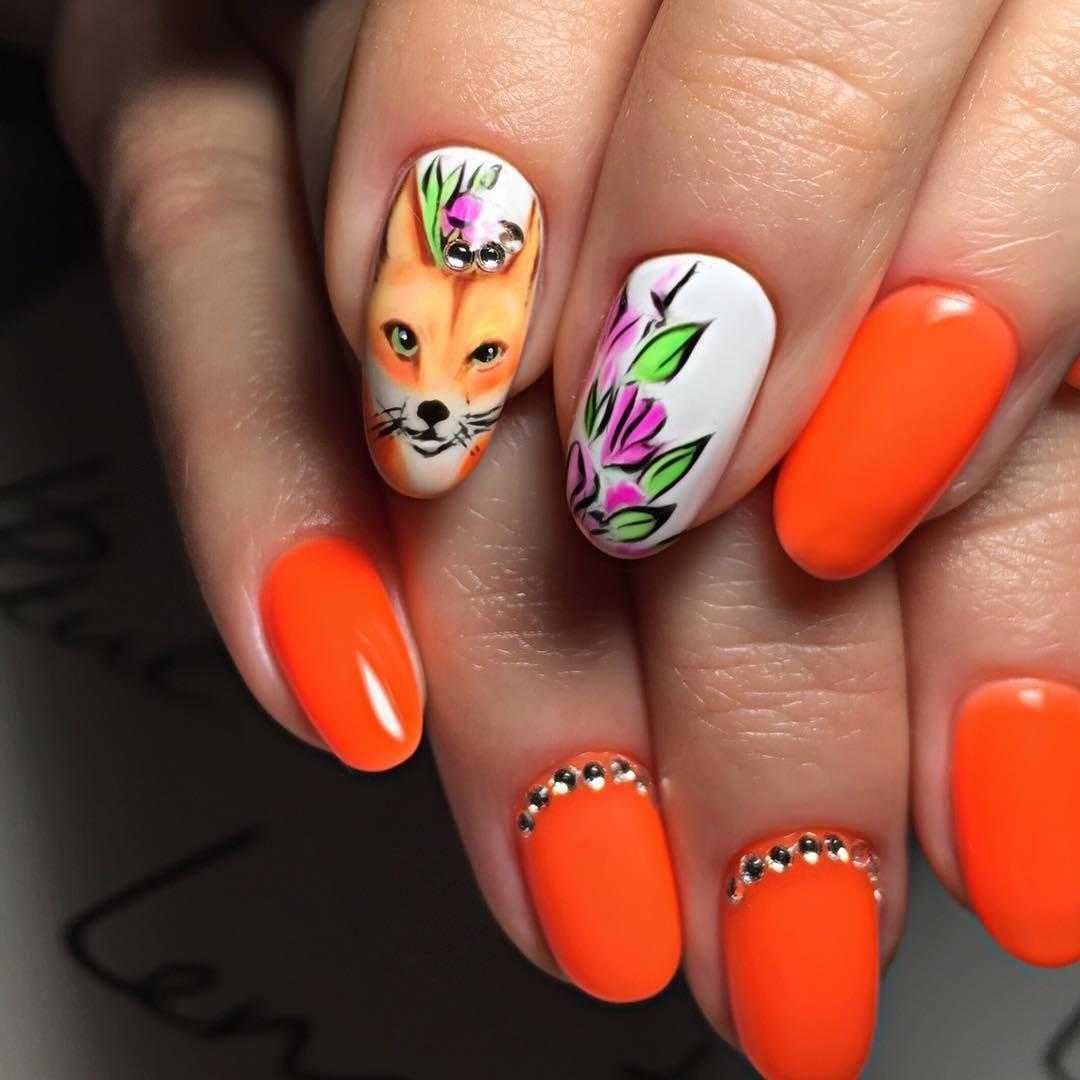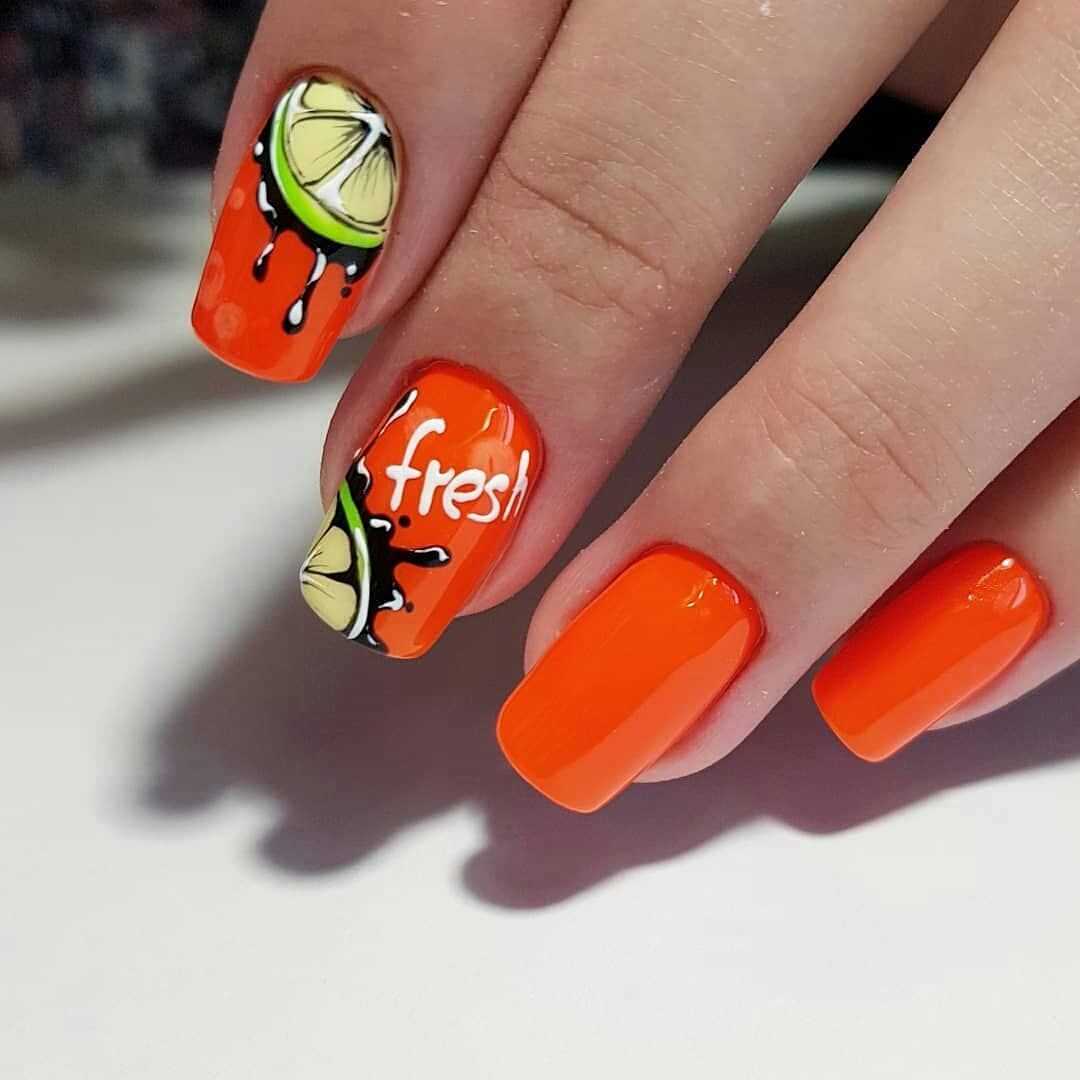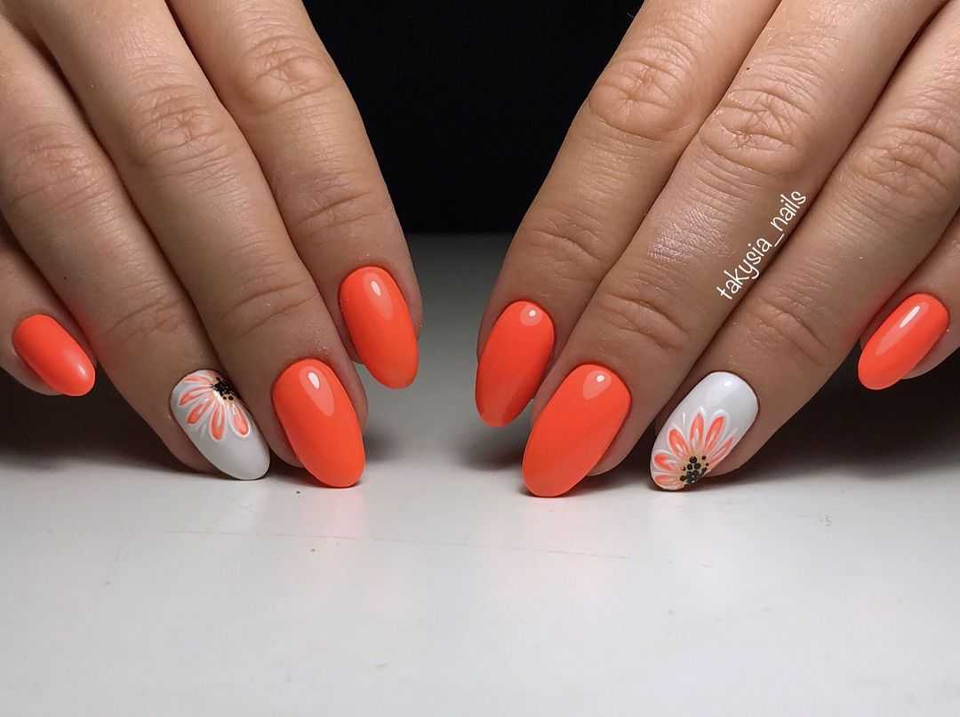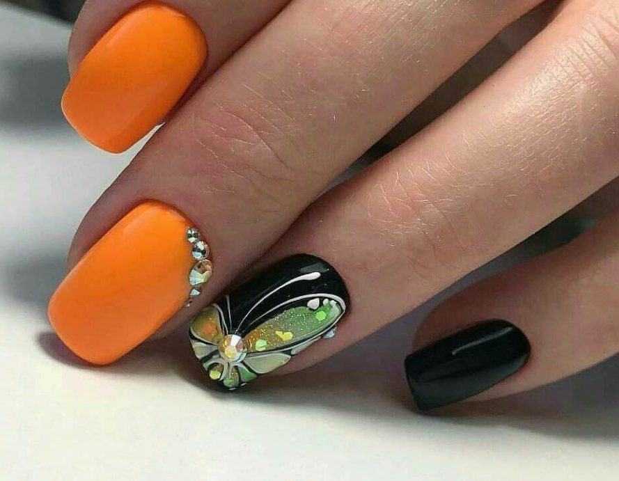 Обладательницам и любительницам коротких ногтевых пластин, придётся по вкусу маникюр в оранжевом цвете. С таким покрытием ноготки будут смотреться объёмнее и насыщенней