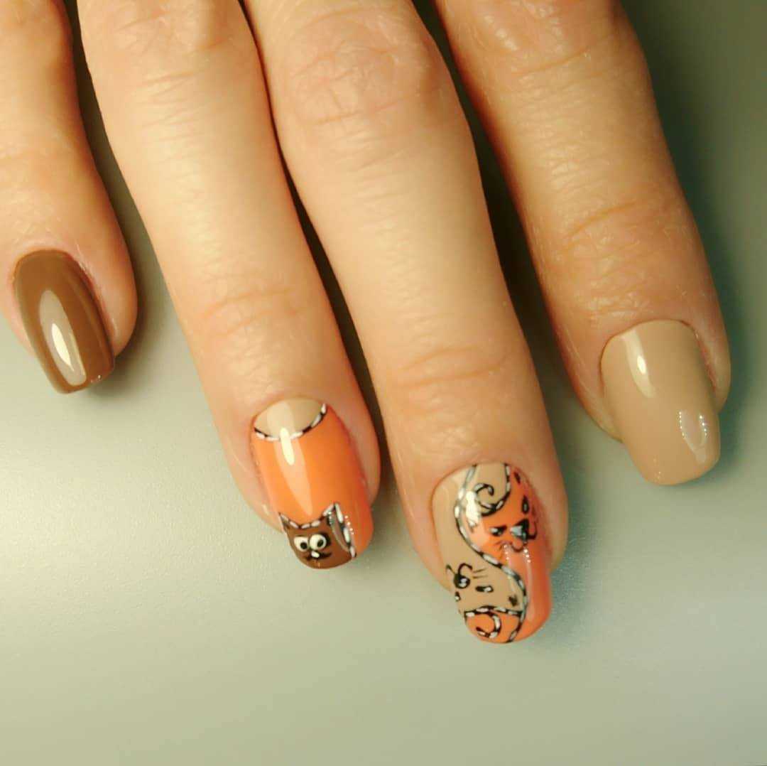 Осенними традиционно считаются в маникюре оранжевые тона в тандеме с более тёмным подтоном. Для идей оформления такого дизайна достаточно всего лишь взглянуть вокруг, ведь сама природа подсказывает нам удивительные примеры для этого варианта. Модными примерами декора осеннего нейл – арта дизайнеры представили нам в этом сезоне пожелтевшие листья, зонтики, дождевые капли и другие тематические изображения, которые выполнены в символике этого периода. Для использования стали актуальными оранжевые, чёрные и красные цвета. Великолепно сочетаются в этом варианте коричневые оттенки и белый цвет. С дополнительными мазками или полосками золота и серебра, ваш маникюр никак не будет выглядеть уныло и скучно.