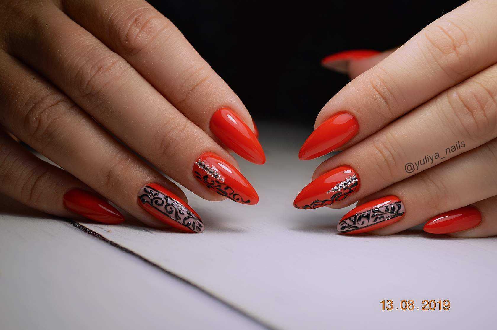Оранжевый оттенок будет давать глубину, что с эстетической точки зрения немаловажно для ногтей такой длины, и визуально удлинять их. Тут важна сдержанность и лаконичность, поэтому лучше отдать предпочтение одному оттенку на всех ноготках