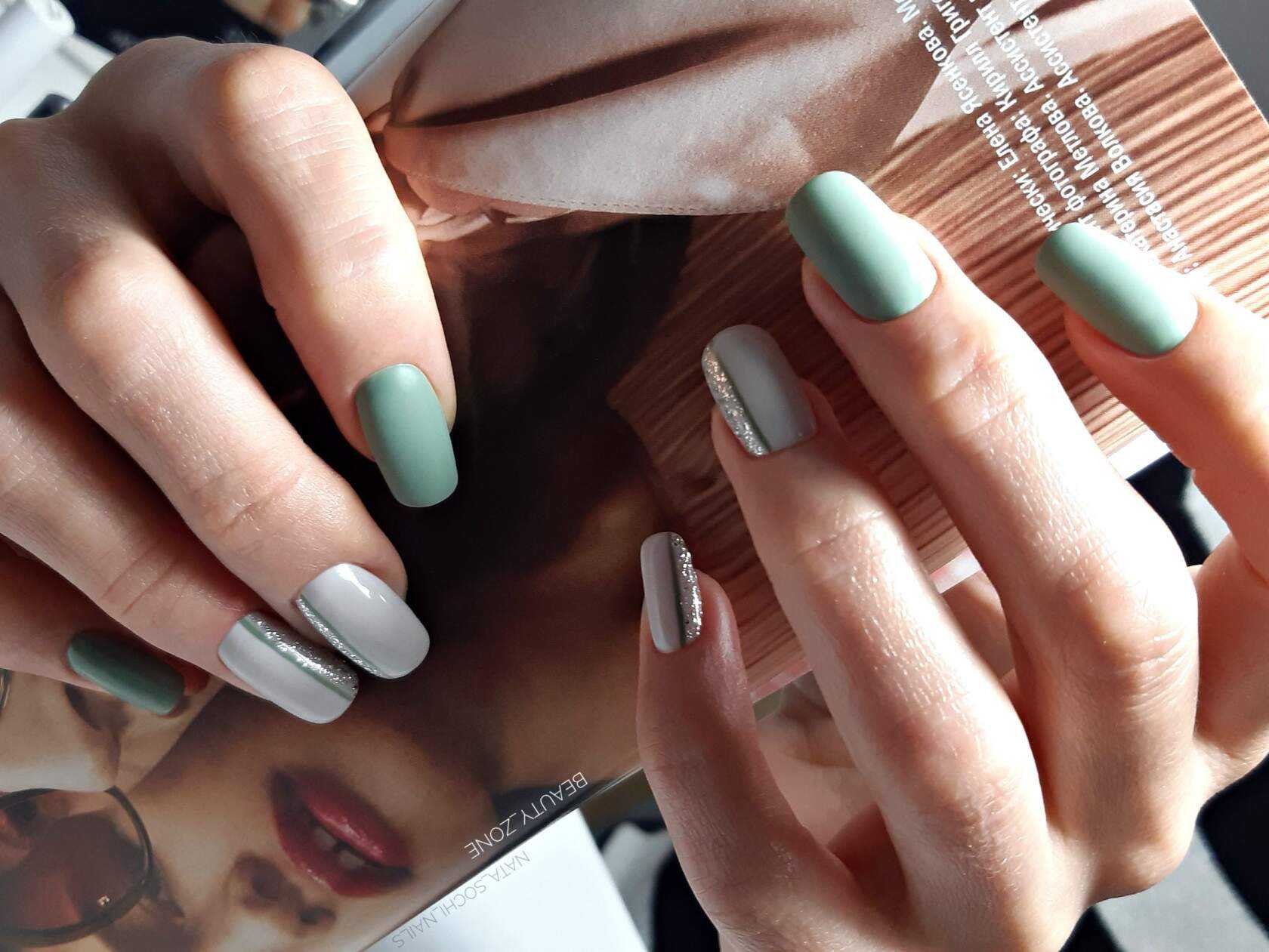 Из всего разнообразия маникюра минимализм особого внимания заслуживает матовый дизайн. На матовой поверхности можно разместить глянцевый декор, акцентные узоры серебряным глиттером и другой выразительный рисунок.