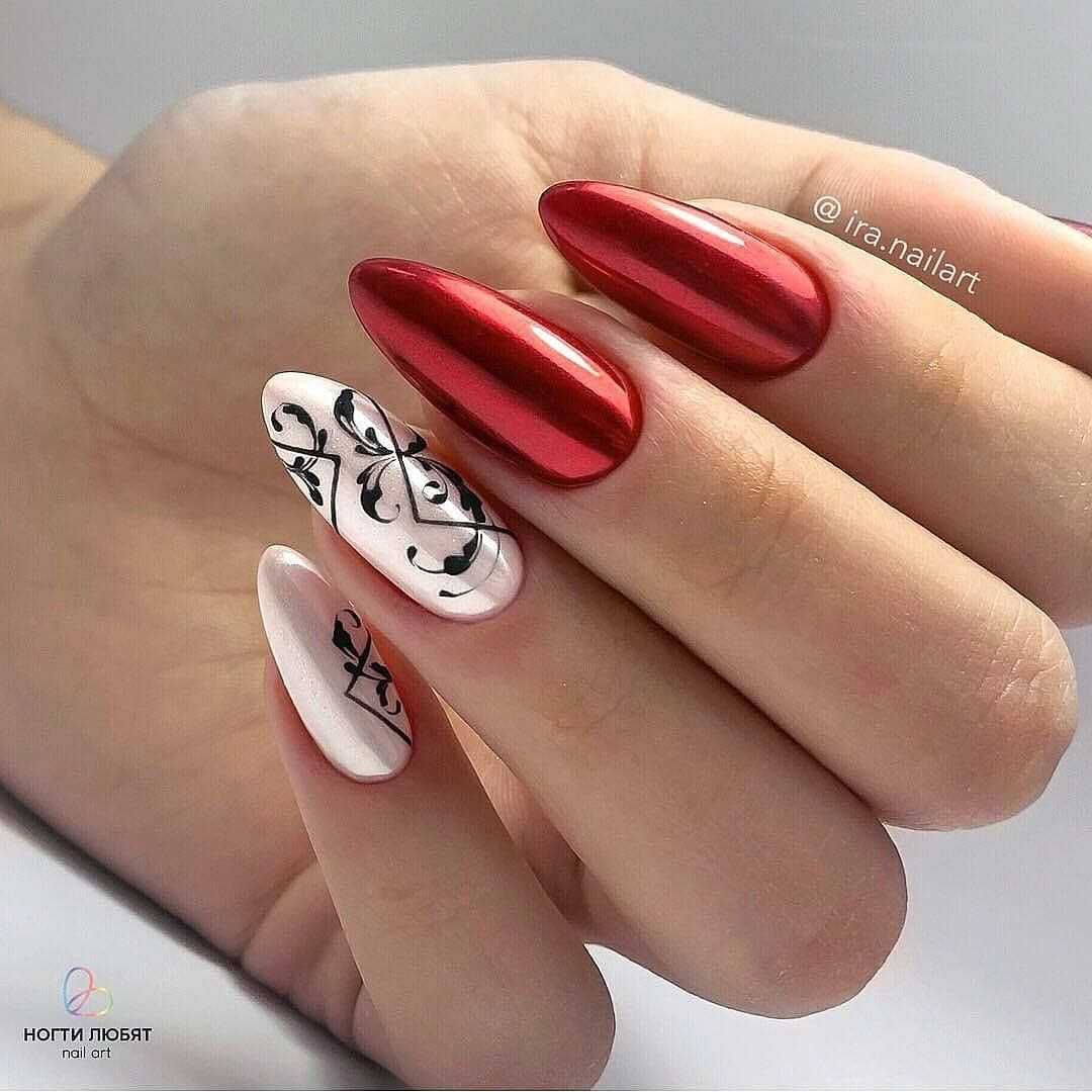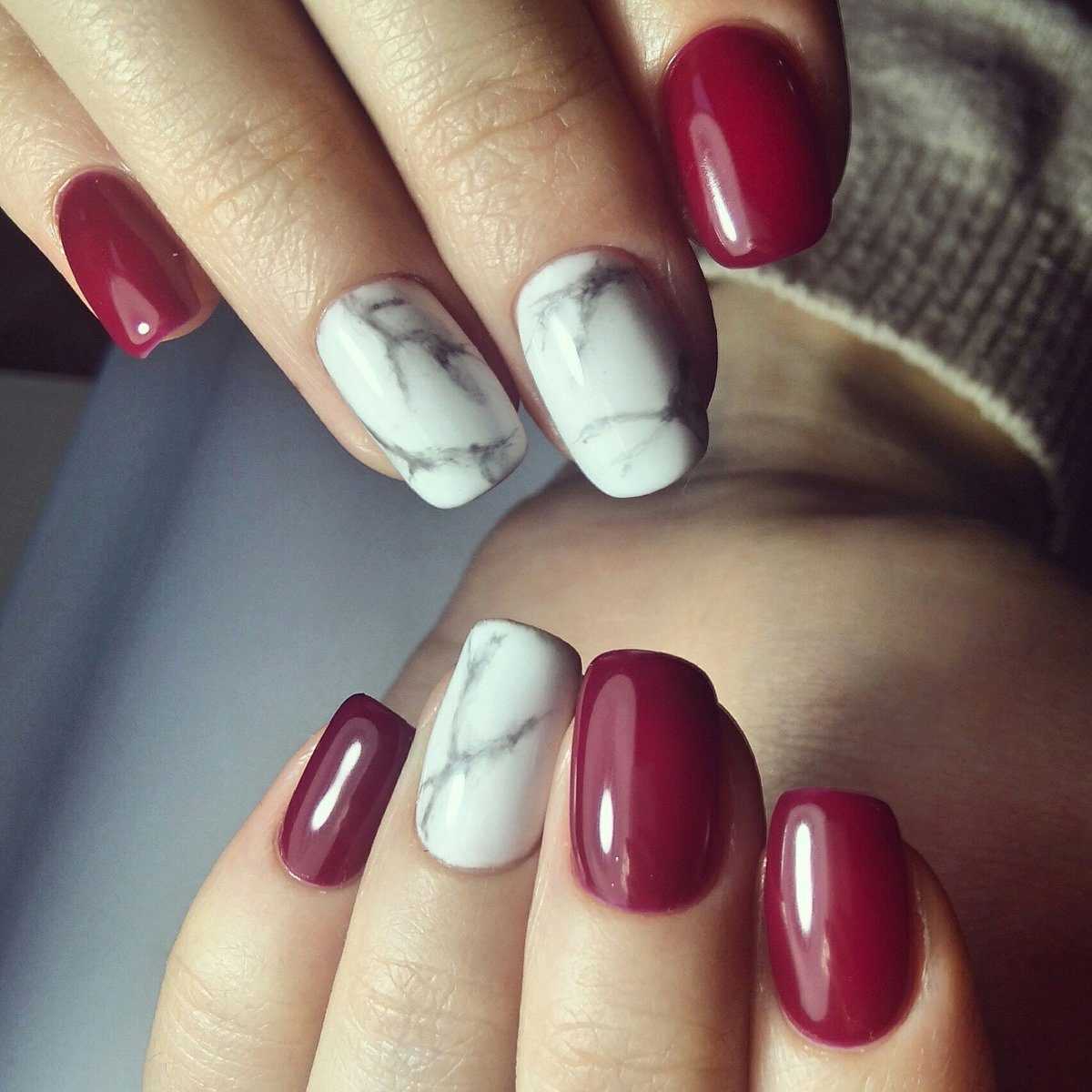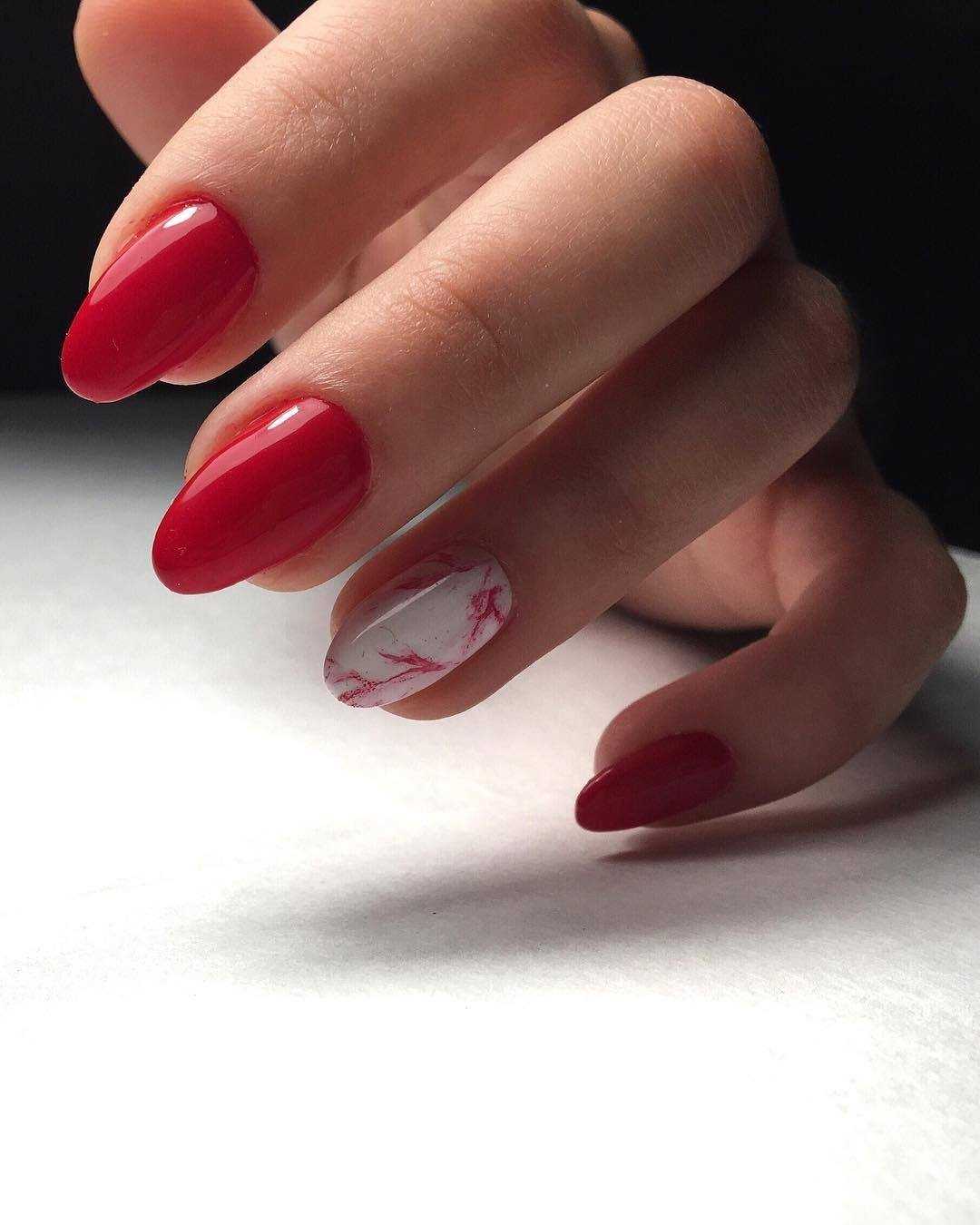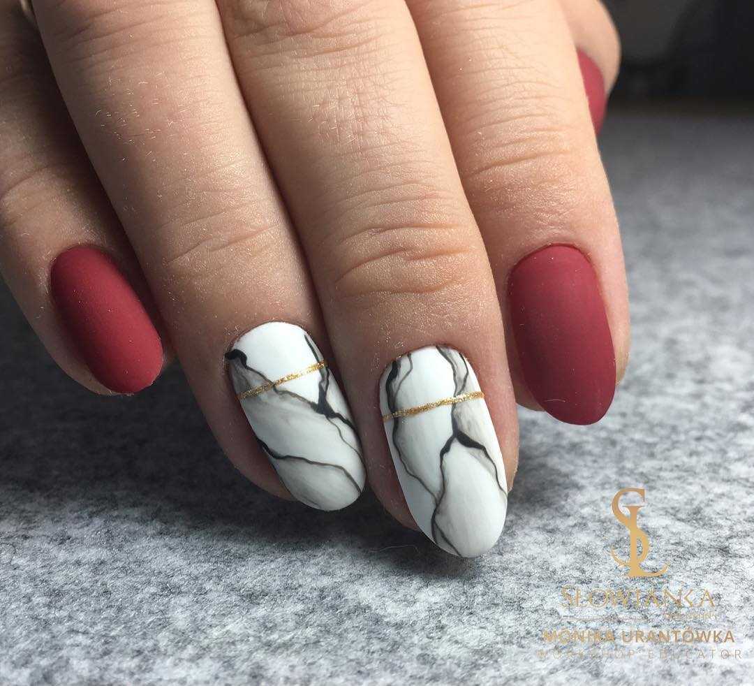 Среди классических решений внимания достойно и красно-черное сочетание. Оно смотрится особенно выигрышно, дерзко. Поэтому его используют в оформлении ногтей достаточно часто. Только представьте, насколько роскошно будет смотреться в таком сочетании френч или геометрический дизайн. Что касается мраморного рисунка, то в таком случае красный цвет выполняет роль основы, а тонкие линии должны быть черными. Наносить их лучше всего специальной кистью. Впрочем в домашних условиях для этого нередко используют простую зубочистку. Конечно же, все это требует практики и только со временем получится создавать удивительной красоты дизайн даже в домашних условиях.