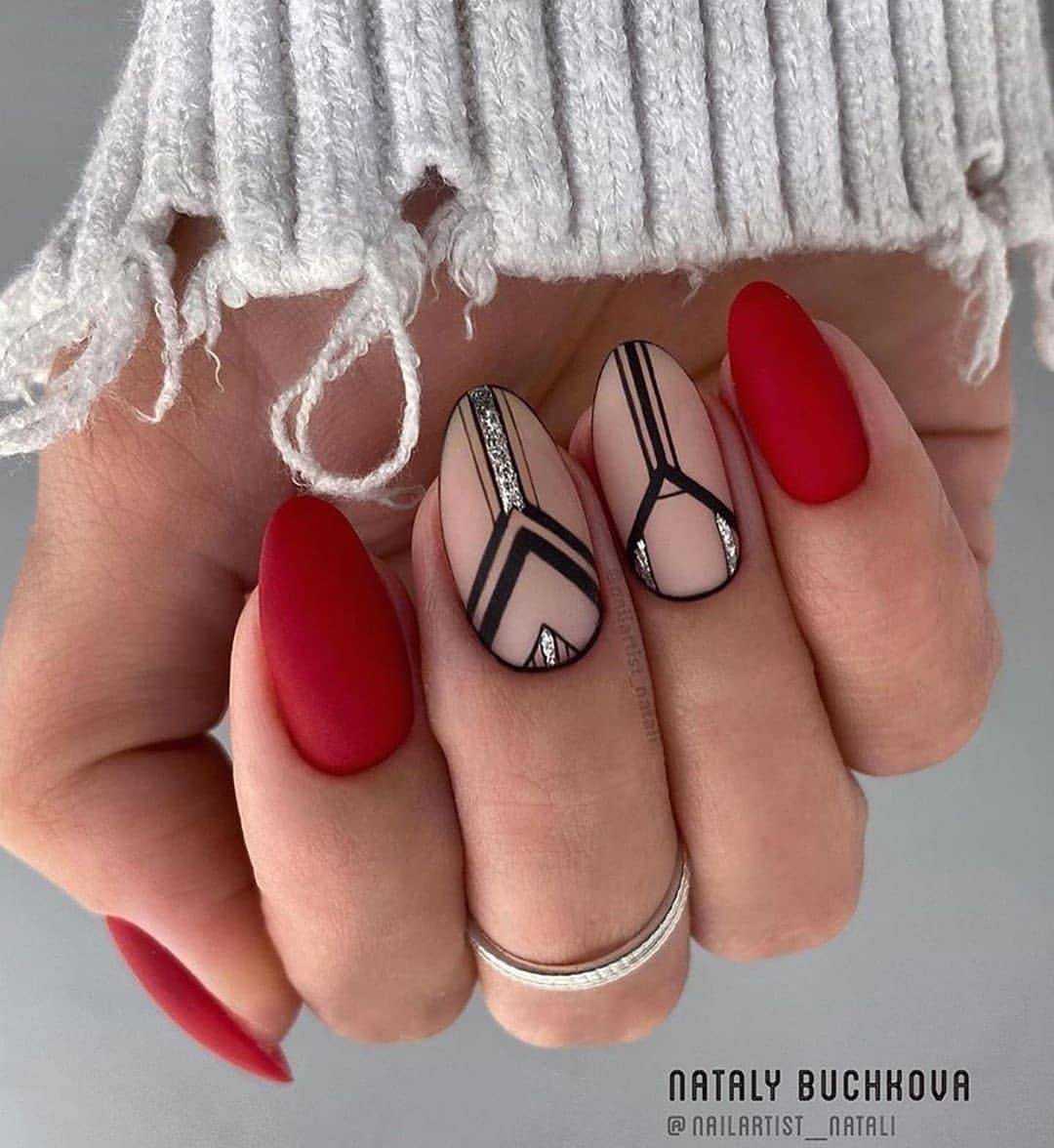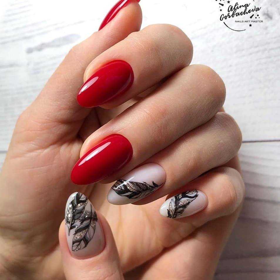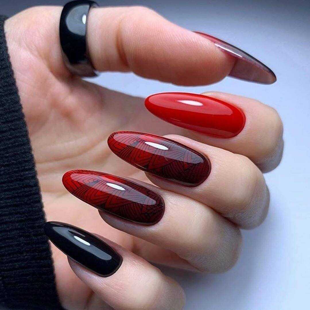 Среди классических решений внимания достойно и красно-черное сочетание. Оно смотрится особенно выигрышно, дерзко. Поэтому его используют в оформлении ногтей достаточно часто. Только представьте, насколько роскошно будет смотреться в таком сочетании френч или геометрический дизайн. Что касается мраморного рисунка, то в таком случае красный цвет выполняет роль основы, а тонкие линии должны быть черными. Наносить их лучше всего специальной кистью. Впрочем в домашних условиях для этого нередко используют простую зубочистку. Конечно же, все это требует практики и только со временем получится создавать удивительной красоты дизайн даже в домашних условиях.