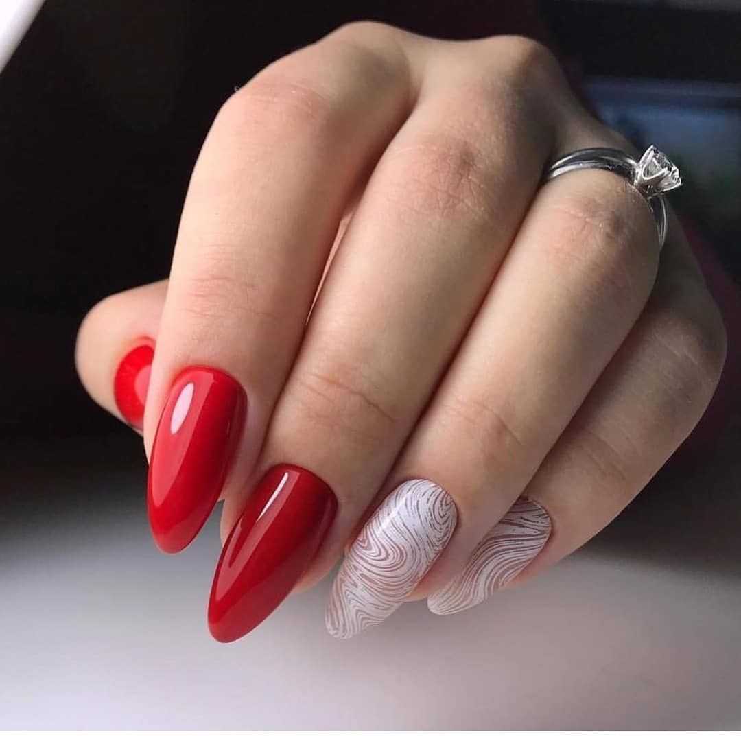 Белым гель-лаком можно изобразить абсолютно любой узор, акцентировать внимание на отдельных ноготках. Самый простой и при этом стильный вариант – поочередное окрашивание ногтей красным и белым цветом