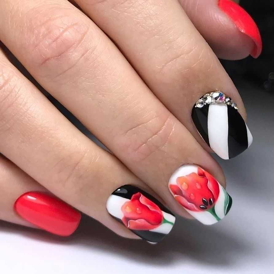 Белый цвет используется в качестве фона для нанесения флористики, геометрии, мраморного декора, абстракции. Визуально сочетание красного и белого смотрится объемно и насыщенно. Присмотритесь к французскому маникюру, где край ногтя выделен красным цветом, а остальное пространство ногтя окрашено белым цветом.