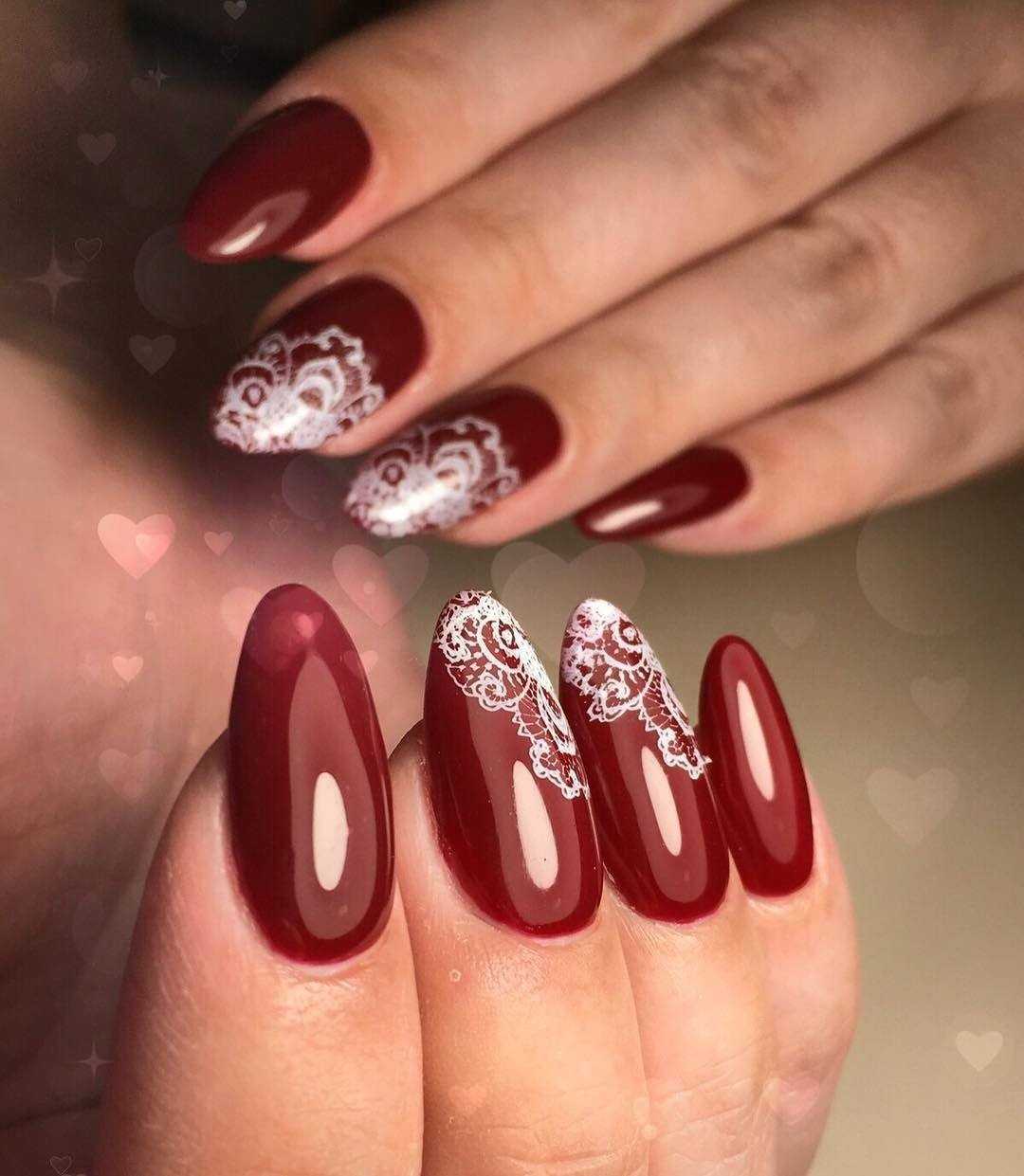 - выбор оттенка для маникюра зависит от отделки платья. Кружевной декор в белом или черном цвете великолепно сочетается с винными и баклажановыми оттенками на ногтях. Черный цвет на ногтях и такая же отделка пусть и гармонируют, но считаются признаком дурного вкуса. Лучше остановить свой выбор на мраморном дизайне или водном маникюре.