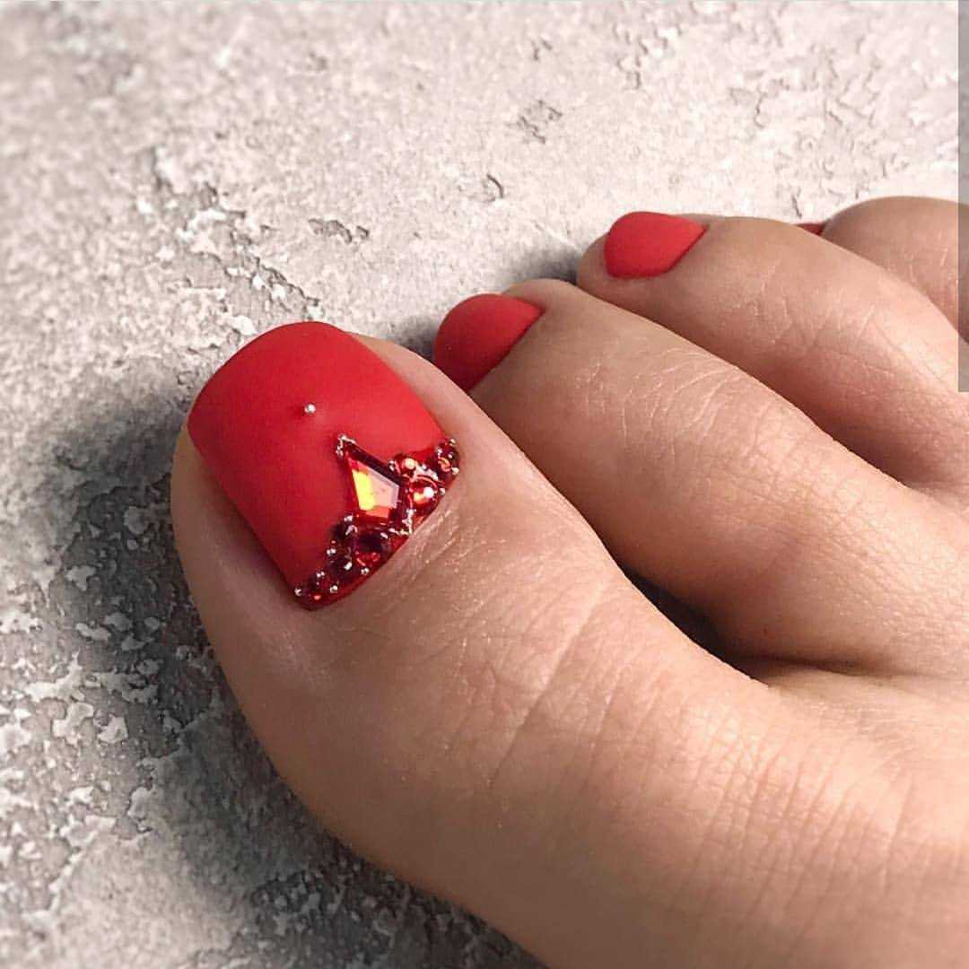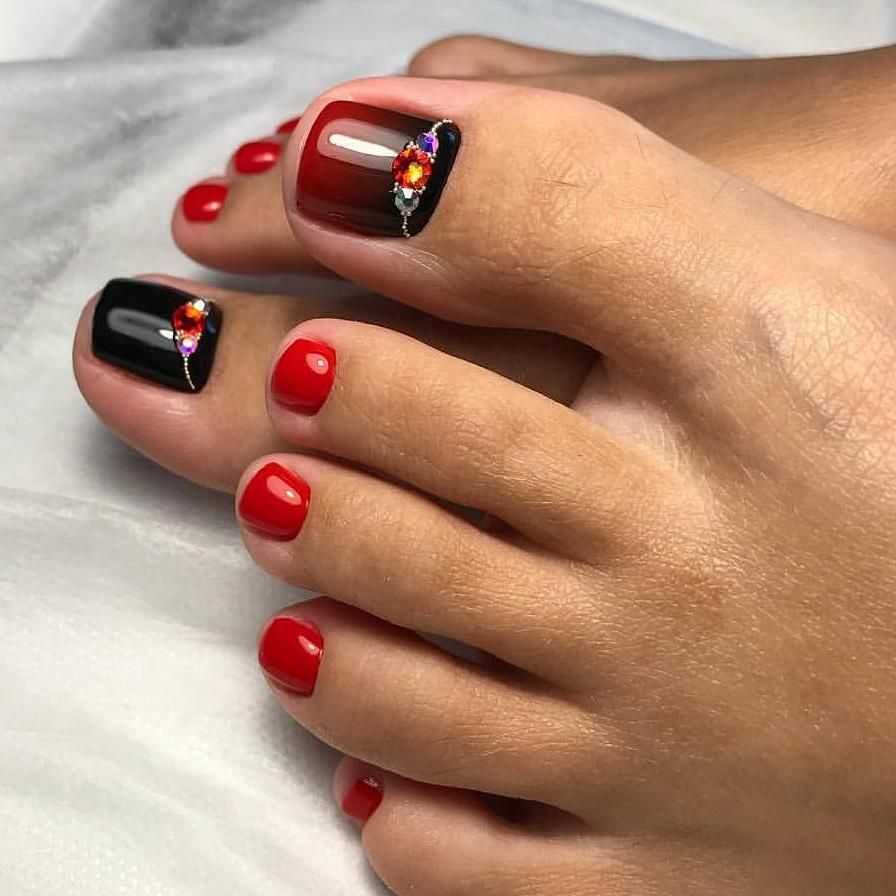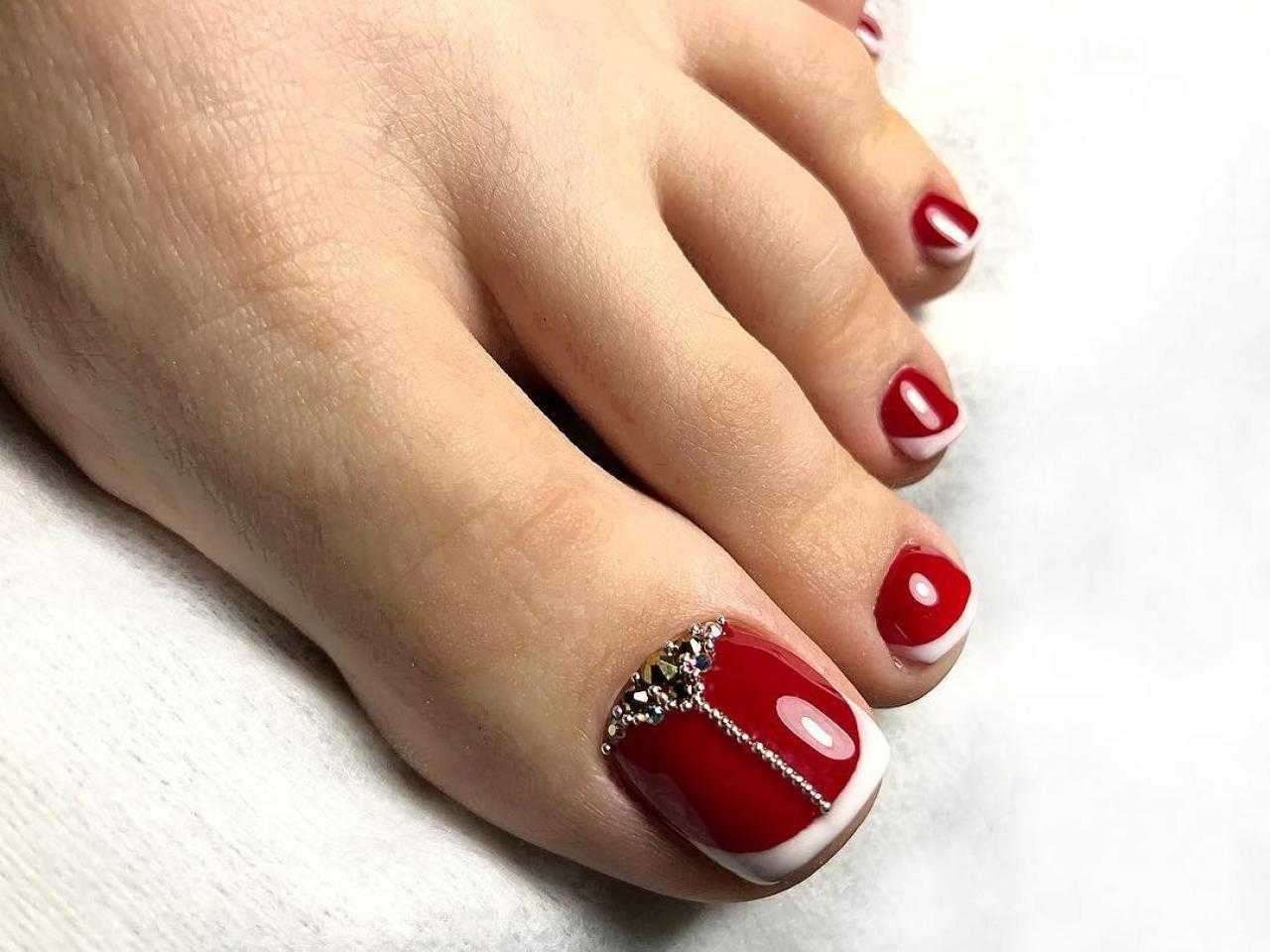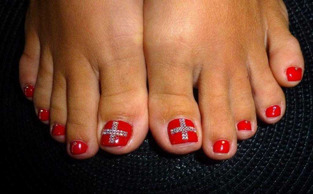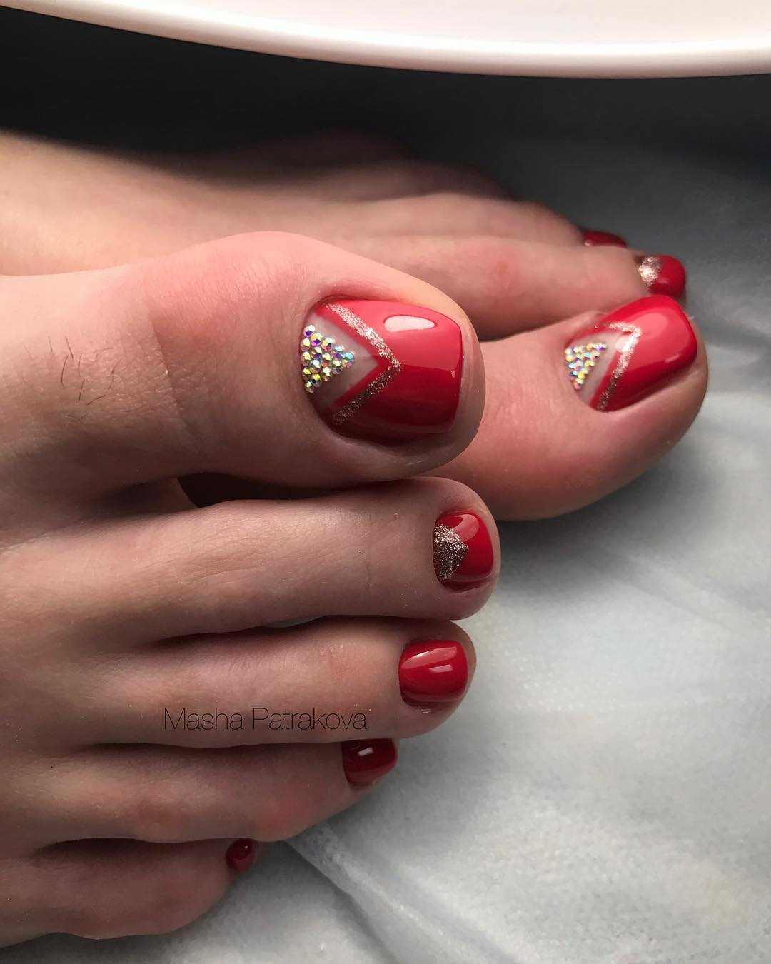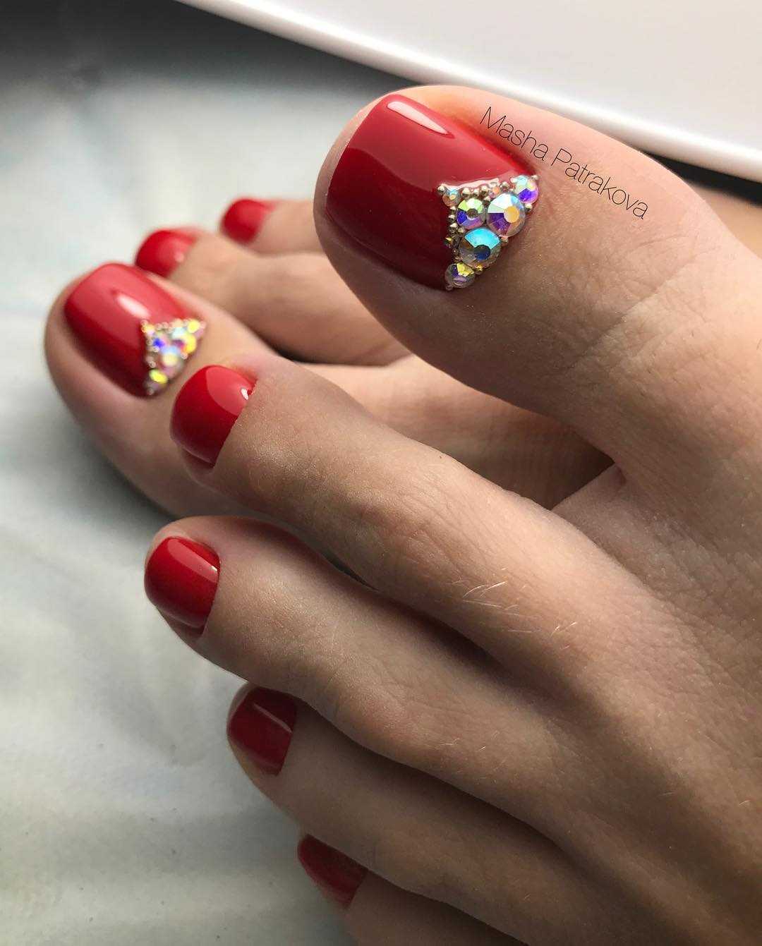 Стразы могут быть прозрачными или иметь оттенок. Интересным вариантом станут детали глубокого красного цвета. В этом случае остальные цвета в педикюре могут отличаться. Такие стразы клеят как поверх красного фона, так и сверху на прозрачную базу. Составление узоров из стразов имеет бесконечное количество вариантов. Стеклышки выкладывают ровными линиями, разделяющими ноготь на зоны. Также можно украсить отросшую часть или выделить лунку у основания ногтевой пластины. Страз может стать завершающим аккордом в нарисованном кистью рисунке или быть частью узора, выложенного такими же деталями. При выборе варианта педикюра со стразами следует убедиться, что сочетание красного и переливов стразов не будет выглядеть вульгарно. Для того, чтобы такой педикюр был шикарным и при этом стильным, лучше выдержать меру и не перегружать композицию блестящими элементами.