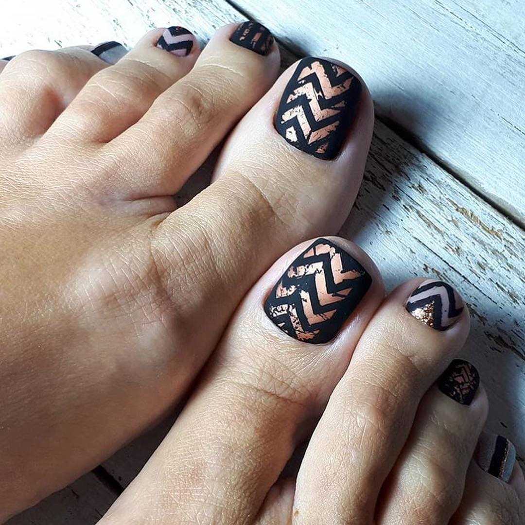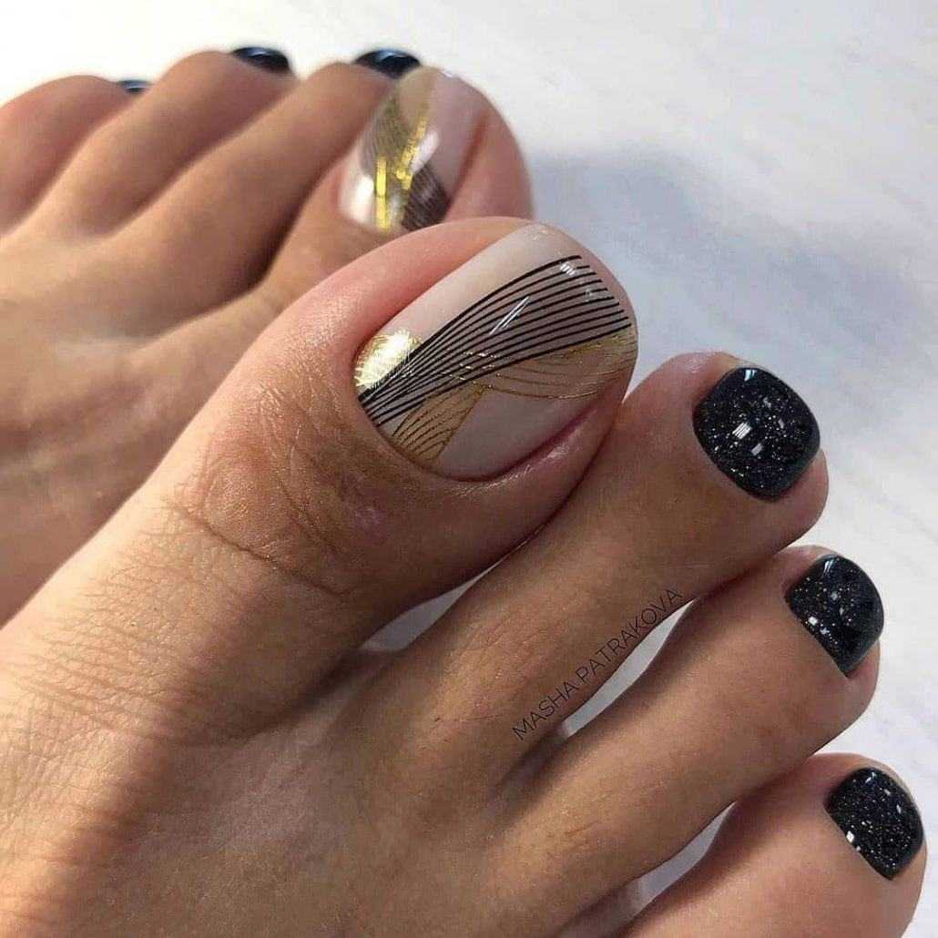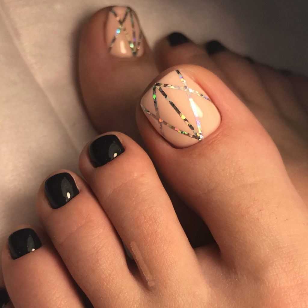 Черно-золотое – прекрасный вариант педикюра для праздничных и торжественных выходов. Эта комбинация считается одной из классических вариантов. Педикюр в таком цвете смотрится невероятно элегантно, изящно и шикарно.