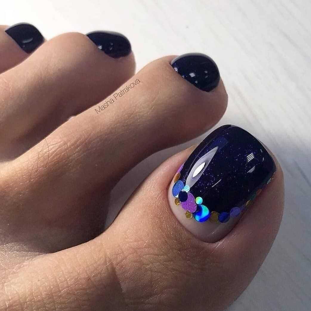 Темный педикюр гарантировано будет смотреться стильно и красиво на ваших ноготках. Черный, синий, темно-зеленый, бордовый дизайн ногтей – универсальный вариант для повседневных и торжественных образов. Даже в однотонном варианте педикюр в темных тонах будет смотреться благородно и дорого.