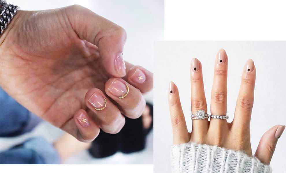 Черные рисунки также хорошо сочетаются с молочным маникюром. Даже простые узоры и точки выглядят гармонично и эффектно, если их нанести с помощью нюдового цвета и черного лака для ногтей.