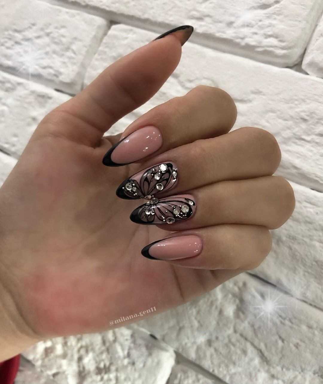 Не менее привлекательно смотрится дизайн в виде бабочки или стрекозы. Чаще всего их рисуют с помощью кистей и цветных красок. Благодаря этому, получается добиться натуральности изображения. В качестве дополнительного декора нейл-мастера используют стразы, которые размещают на крылышки. Всего несколько штук и маникюр преображается до неузнаваемости.
