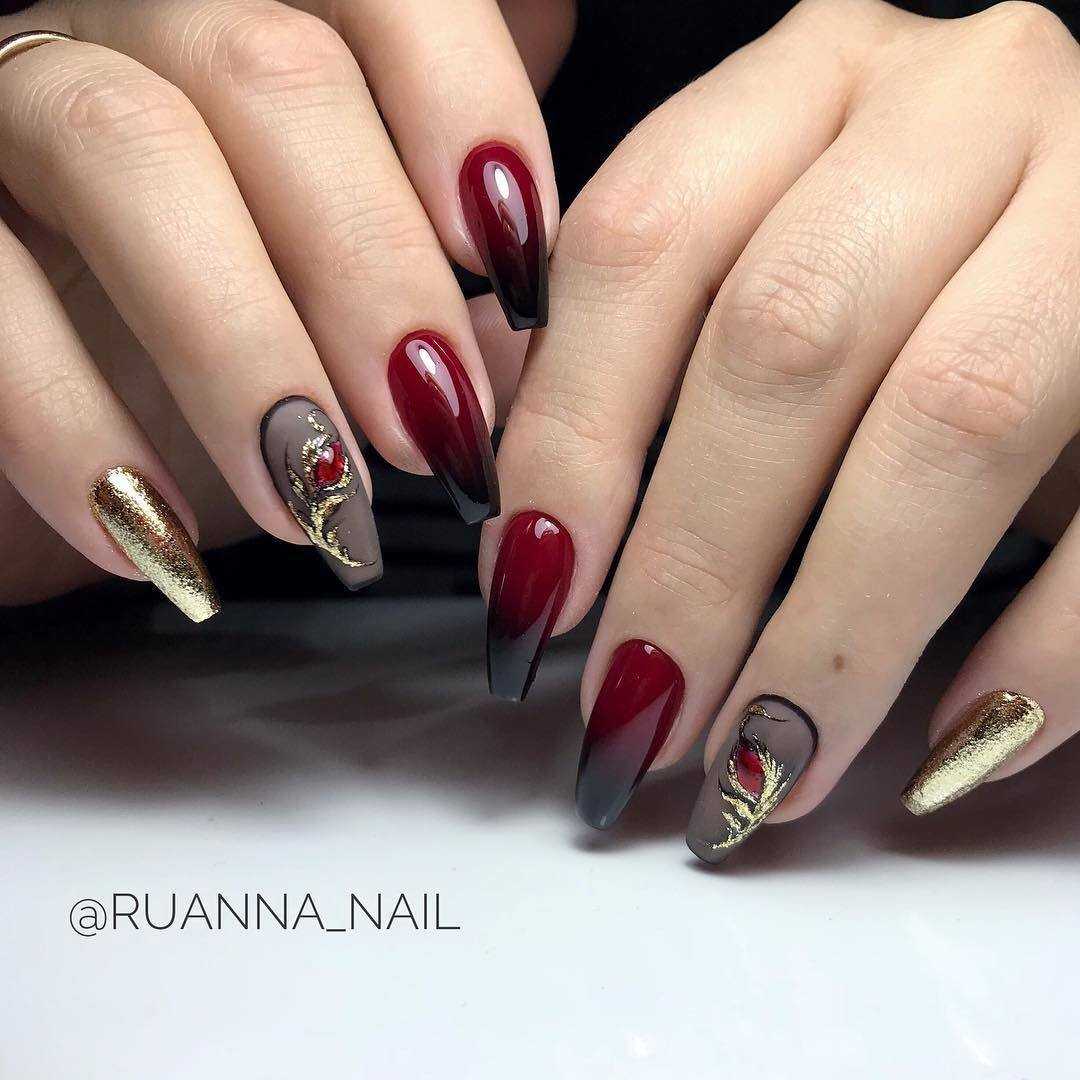 Красные оттенки сами по себе считаются чувственными и страстными, из-за этого подобные расцветки маникюра подходят тем девушкам, которые не боятся быт в центре внимания и быть яркими. Чёрный цвет же добавляет ещё большей глубины в подобный дизайн. Несмотря на то, что красно-чёрный маникюр тёмный и строгий – он привносит в образ загадочности и подчёркивает характер его владелицы. Разбавить подобную цветовую гамму роскошными золотыми цветами – прекрасное решение, ведь такой дизайн подойдёт и для вечернего выхода в свет, и для повседневной носки, хорошо вписываясь во многие образы. Самой выгодно смотрящейся техникой на красно-чёрных ноготках будет фольгирование, придающее дизайну интригующих ноток и особого шарма. Более современно и минималистично будет выглядеть техника колор блок, в которой можно выгодно сочетать все три цвета с помощью незамысловатых геометрических фигур.