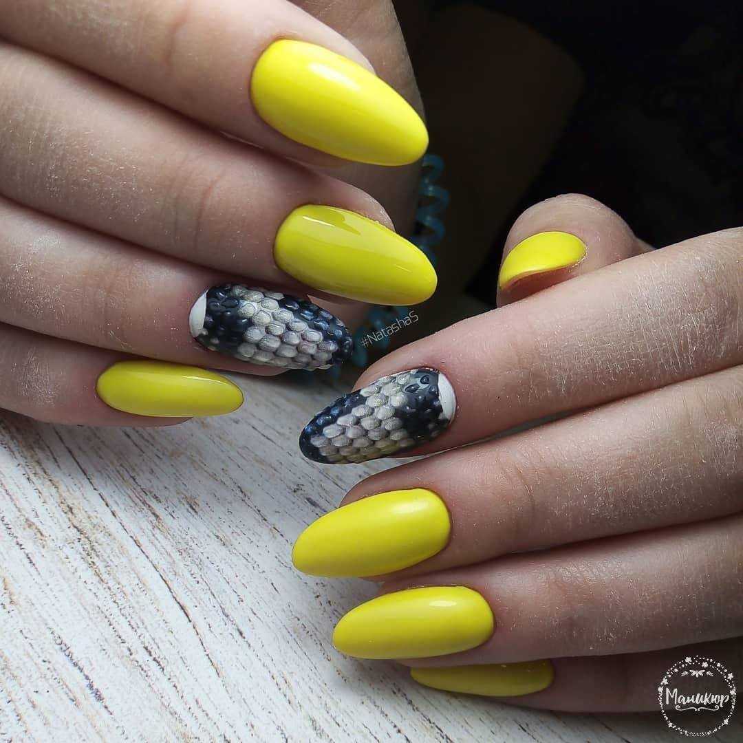 Змеиный принт вмещает в себя множество вариаций нанесения рисунка на ногти, который имитирует кожу рептилии, например, змеи или крокодила. Выполняется такой дизайн приближёнными к реальности цветами – зелёными, жёлтыми, коричневыми, серыми, с применением глиттера и блёсток. Мастера расписывают ноготки вручную, используют технику стемпинга или готовые наклейки. Большим спросом пользуются изображений кожи рептилий или змеиные глаза.