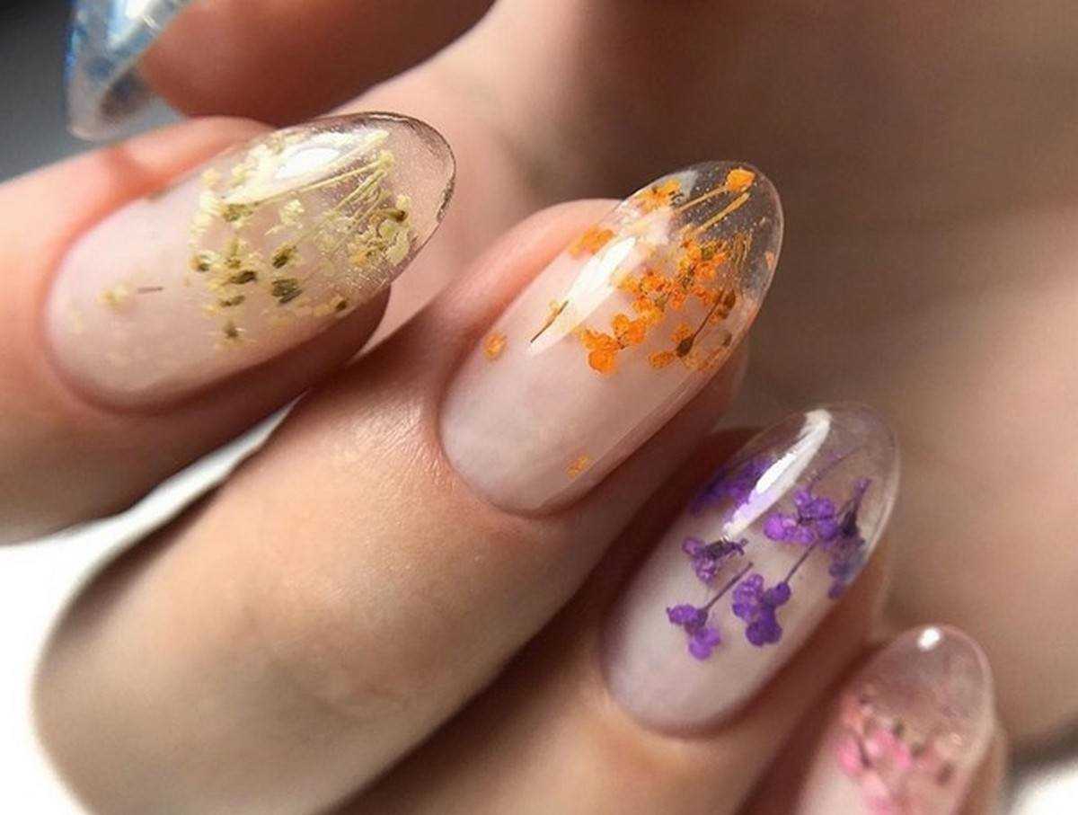 Любительницам светлого, нежного маникюра определенно стоит попробовать сухоцветы. Они довольно тонкие, простые, но визуально сильно преображают дизайн ногтей. Для такого эффекта стоит выбирать полупрозрачные или светлые оттенки лака. Благодаря этому получится подчеркнуть нежный цветочный маникюр.