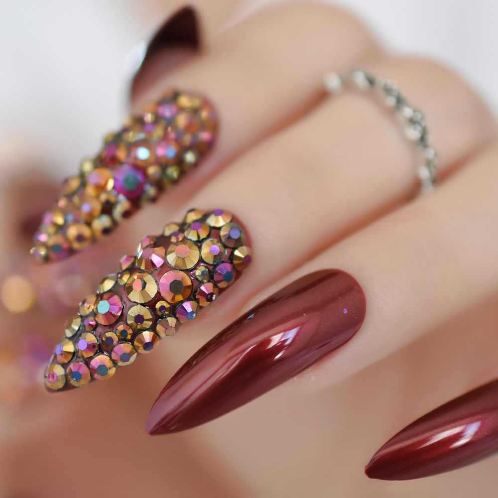 На длинные ногти ограничений практически нет (кроме здравого смысла и чувства меры). Вы можете позволить себе довольно сложные и затейливые композиции из страз разного размера и цвета, дополнить цветочные узоры, геометрические узоры, тематический маникюр ярким декором (например, сделать новогодний маникюр со стразами новогодний шар).Также можно полностью покрыть стразами всю ногтевую пластину на одном ногте — все будет смотреться стильно и интересно.