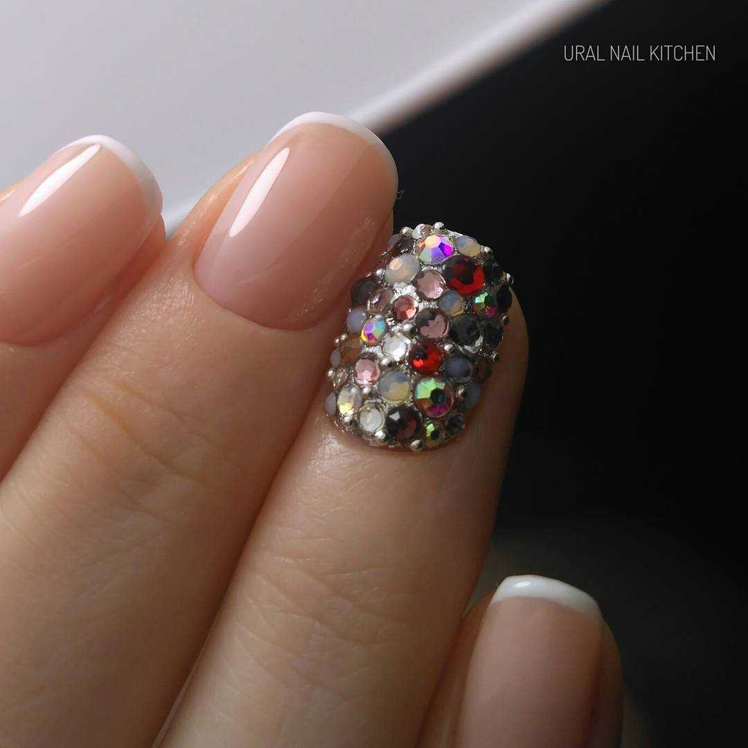 Так, для коротких ногтей важно, чтобы стразы были миниатюрными по размеру, а общий дизайн маникюра стремится к простоте и лаконичности. Небольшая площадь бархатцев не даст мастеру «блуждать», поэтому идеальным и всегда беспроигрышным вариантом будут одиночные стразы на однотонном покрытии