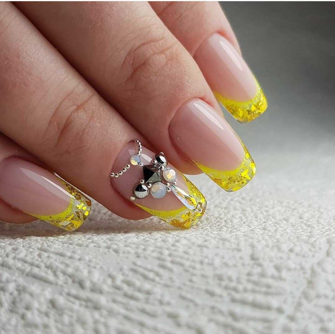 Независимо от выбранного варианта, однотонный маникюр прекрасно смотрится с блестящим декором. Поскольку он буквально добавляет ему яркости. Что касается расположения, то такие детали преимущественно размещают в прикорневой зоне на нескольких ноготках. Это дает возможность сделать акцент в маникюре, но при этом не слишком вызывающий. Для лучшего закрепления используйте прозрачный топ.