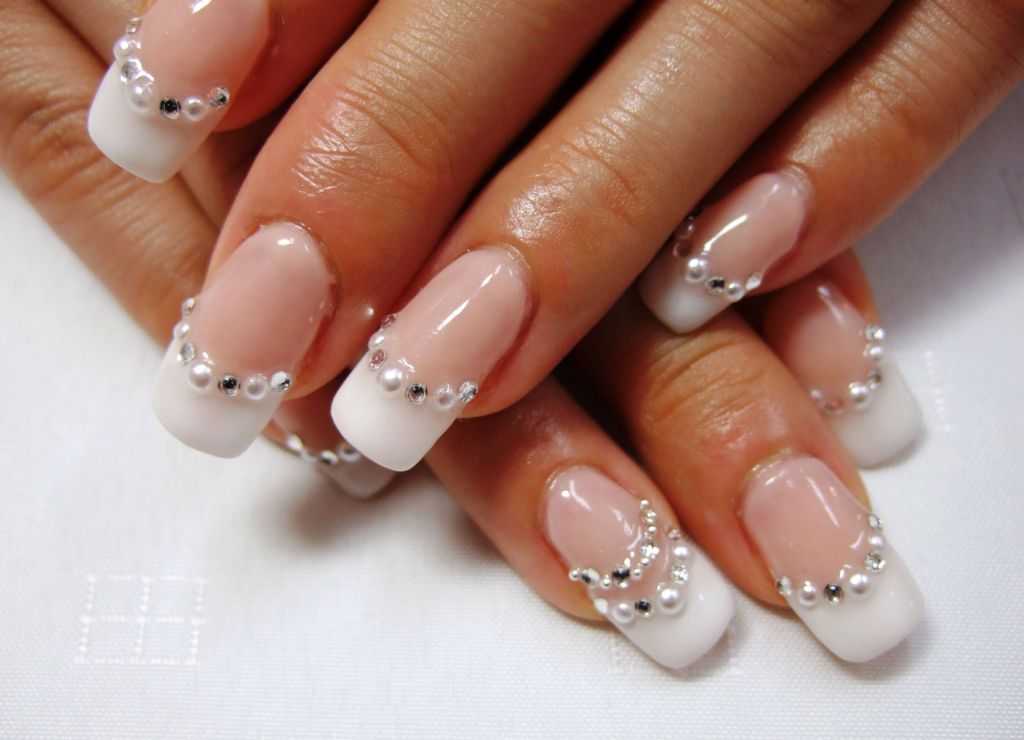 Маникюр для свадебного торжества должен быть выполнен с однотонными белыми камушками. Никаких цветных страз, которые абсолютно не подходят под белоснежное платье. Многие модницы выполняют свадебный маникюр в ажурной технике. При этом используются кусочки от свадебного платья или фаты.