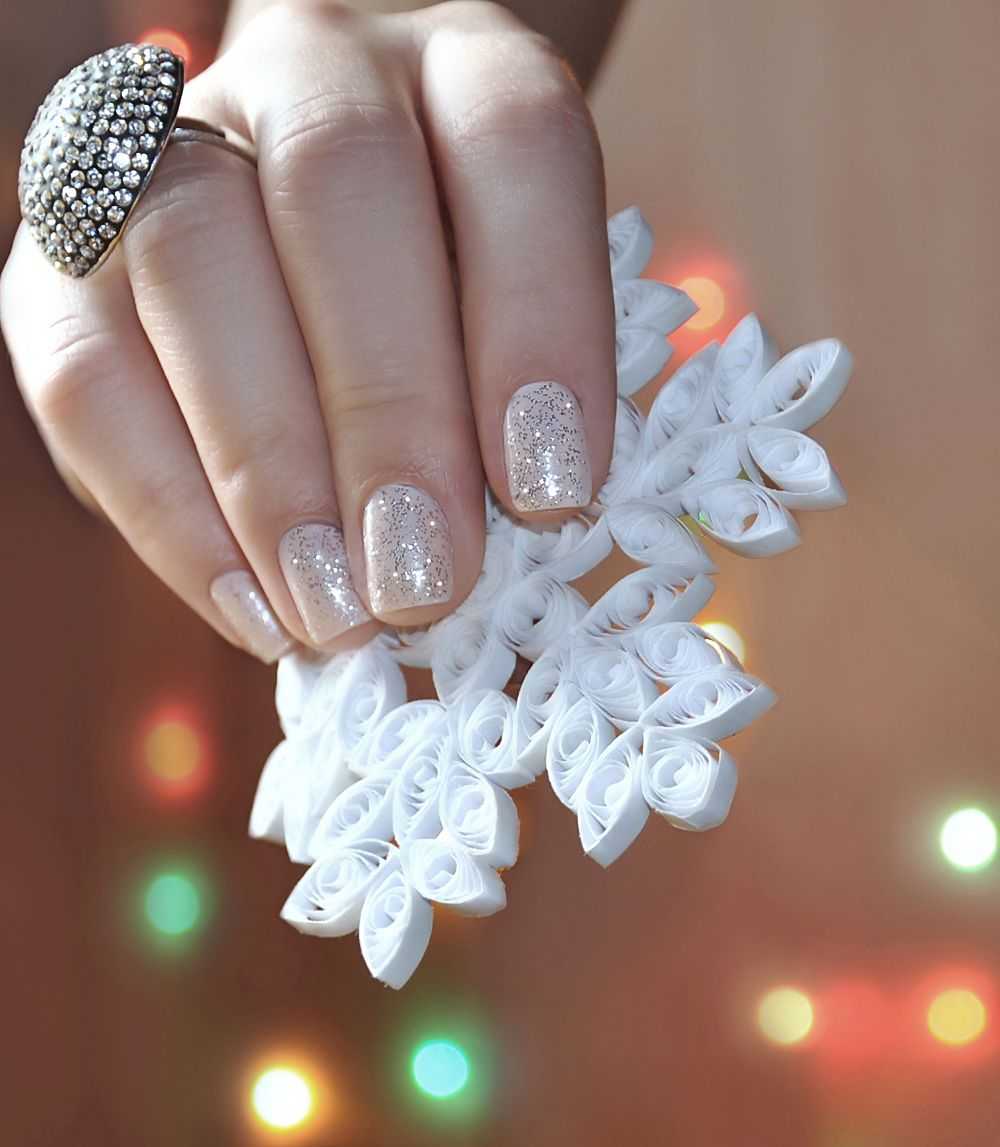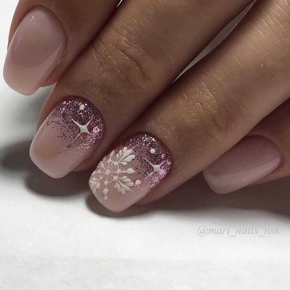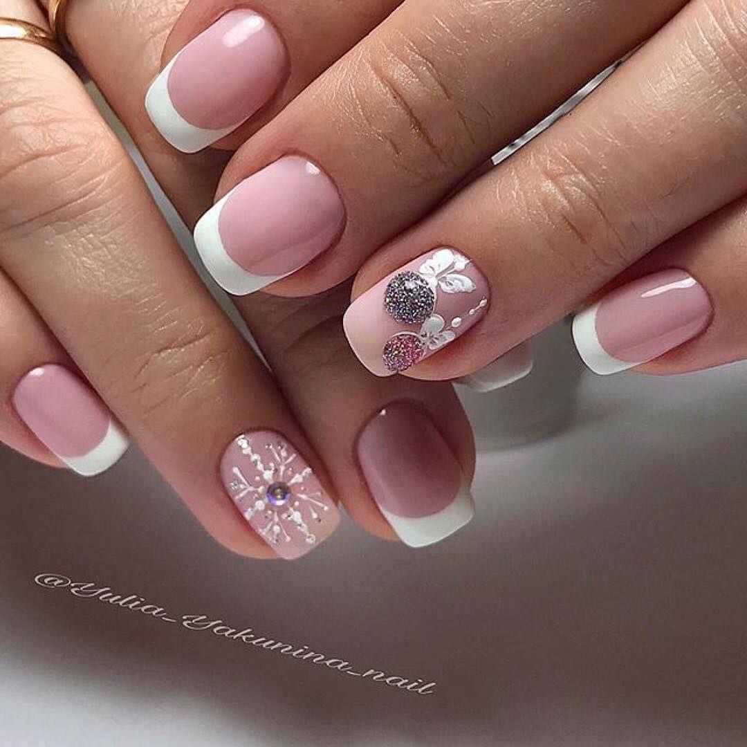 - белый – универсальный цвет, который особенно уютно выглядит зимой. В тренде как однотонное покрытие ногтей, так и декор акриловой пудрой, глиттером, фольгой.