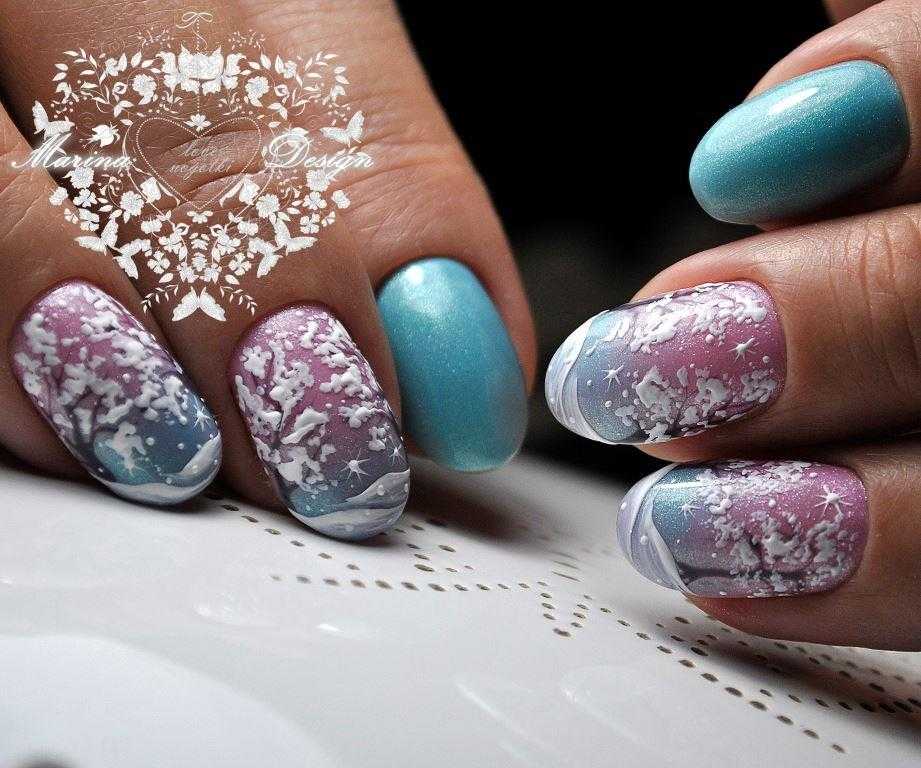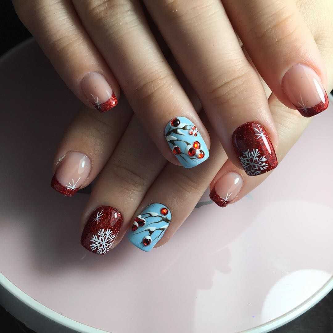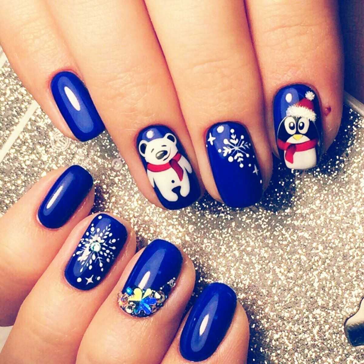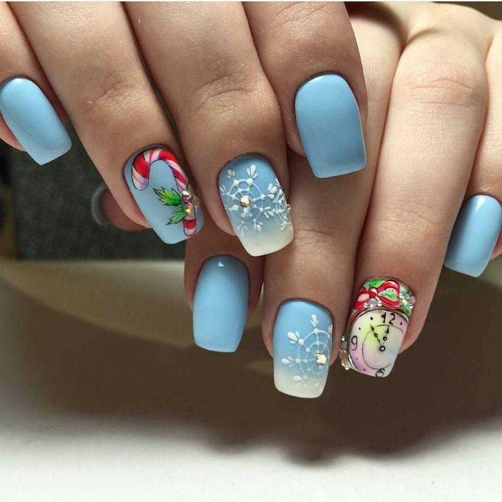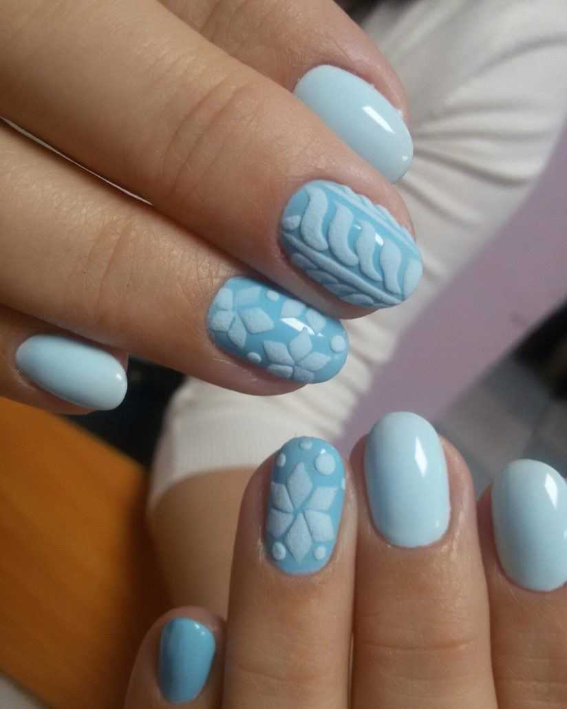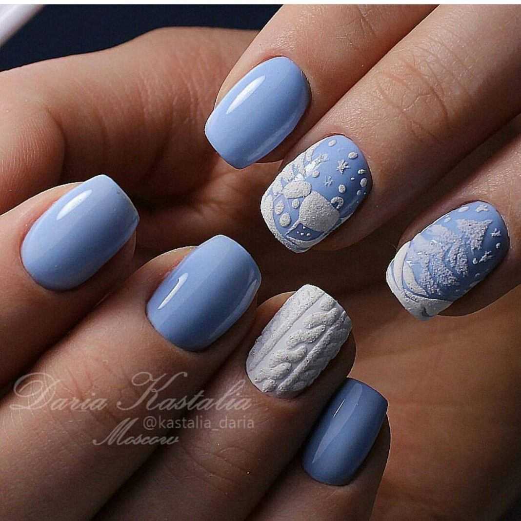 - голубой – легкий и универсальный цвет, который часто используется для выполнения зимнего тематического маникюра с елочками, снежинками, варежками, мишками Тедди