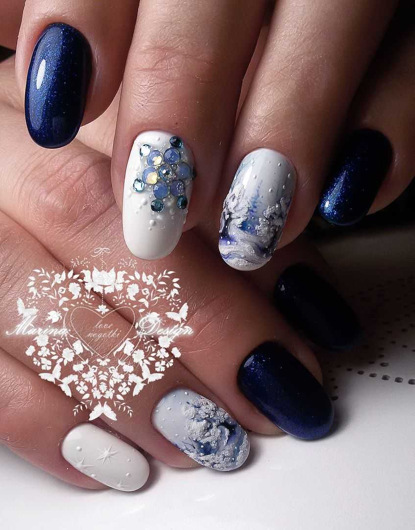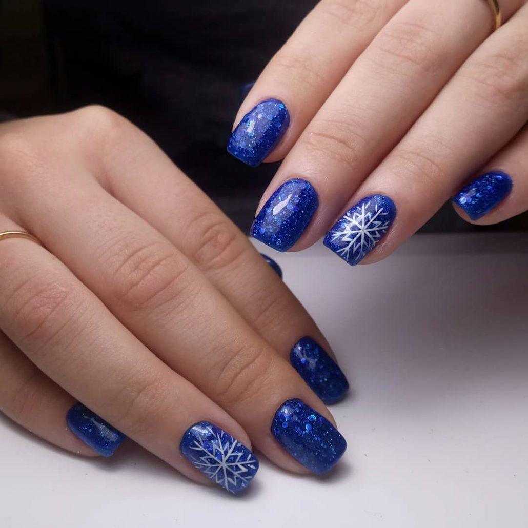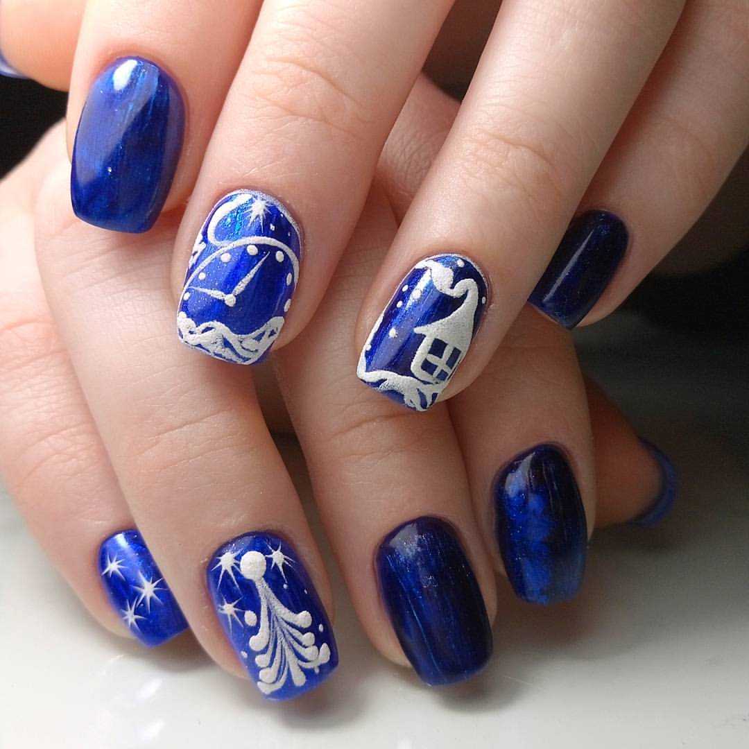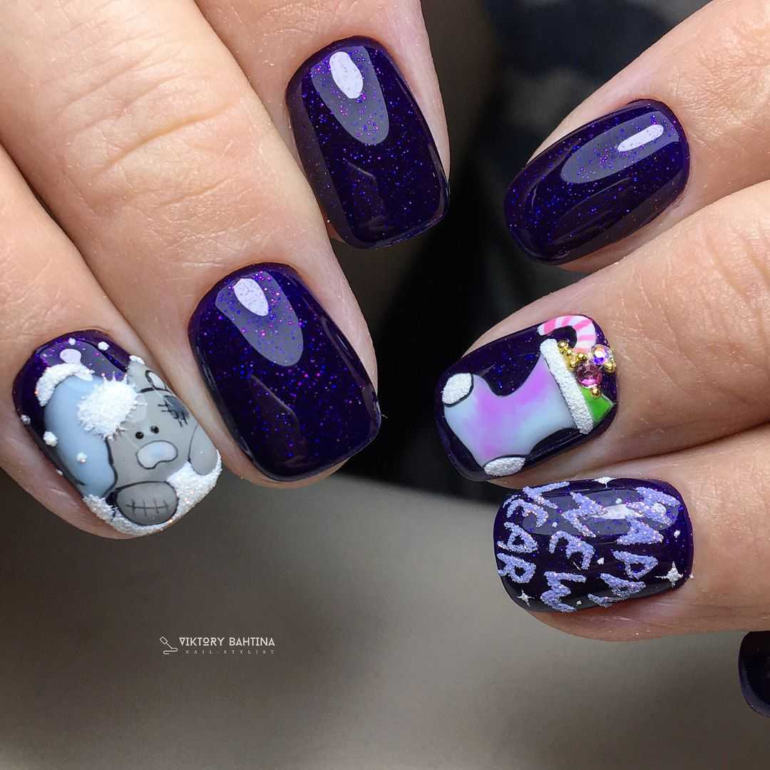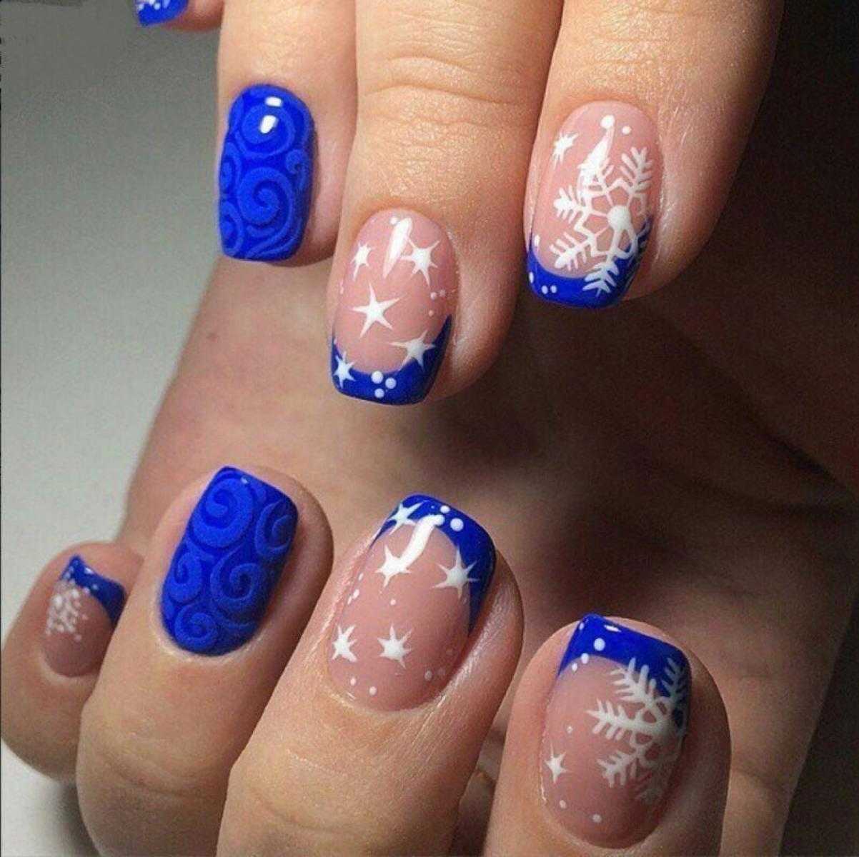 - голубой – легкий и универсальный цвет, который часто используется для выполнения зимнего тематического маникюра с елочками, снежинками, варежками, мишками Тедди