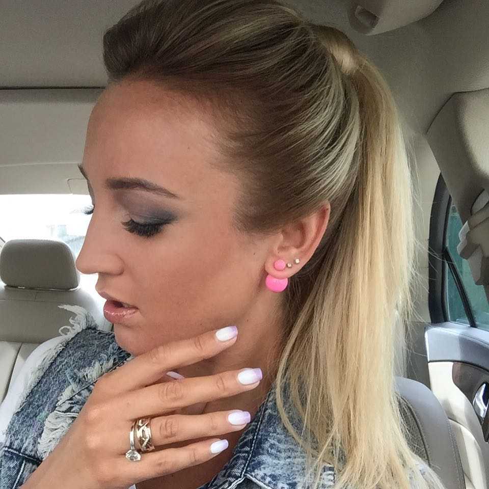 Для знаменитости не принципиально, чтобы ногти всегда были натуральными. Она может выбрать любую форму, ориентируясь на тренды с модной индустрии. Недавно модель и участница реалити-шоу была замечена с формой пуанты относительно небольшой длины. Цвет пластины был очень нежным, с матовым топом.