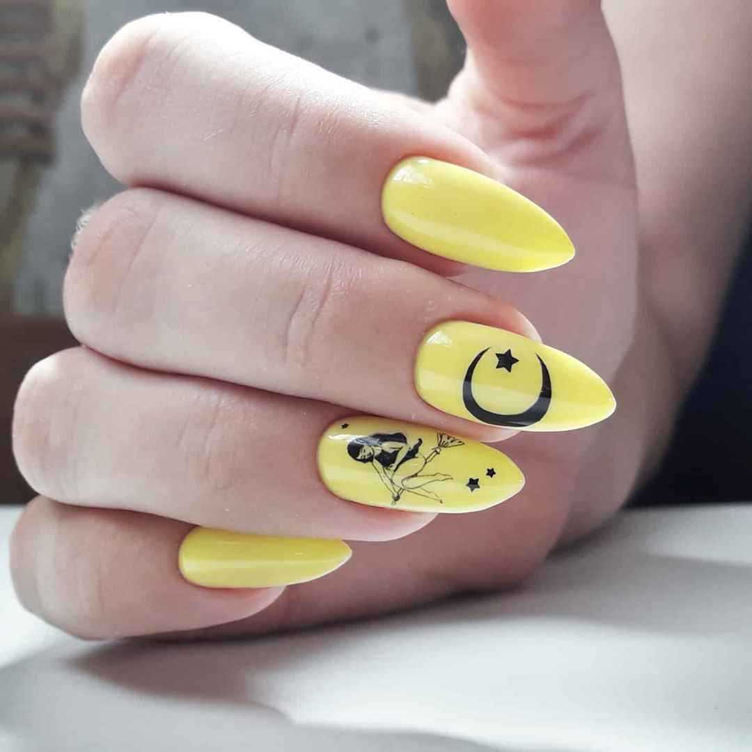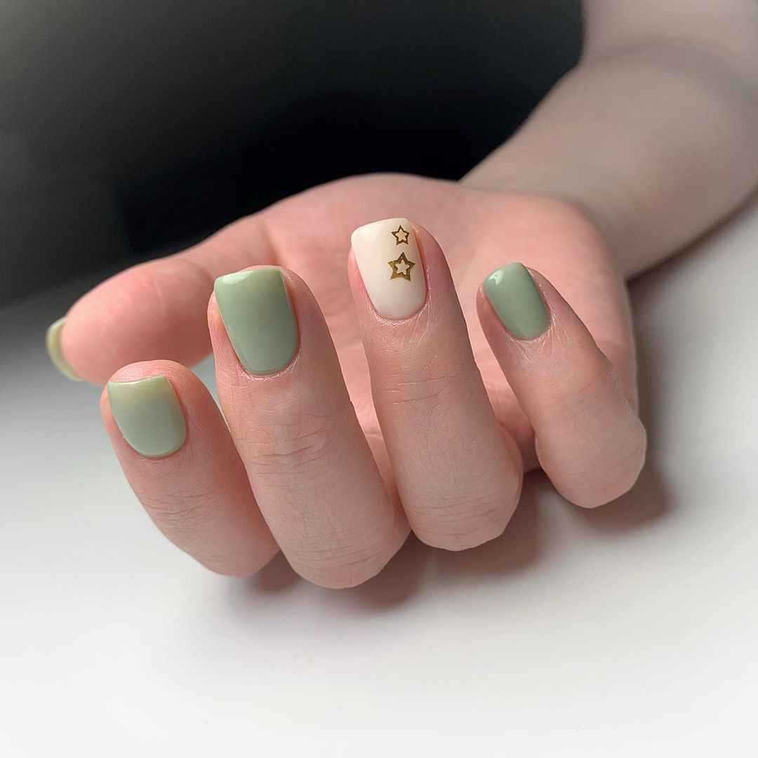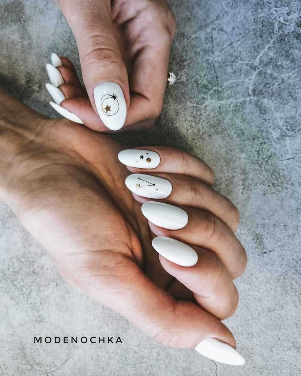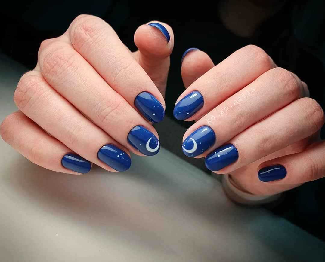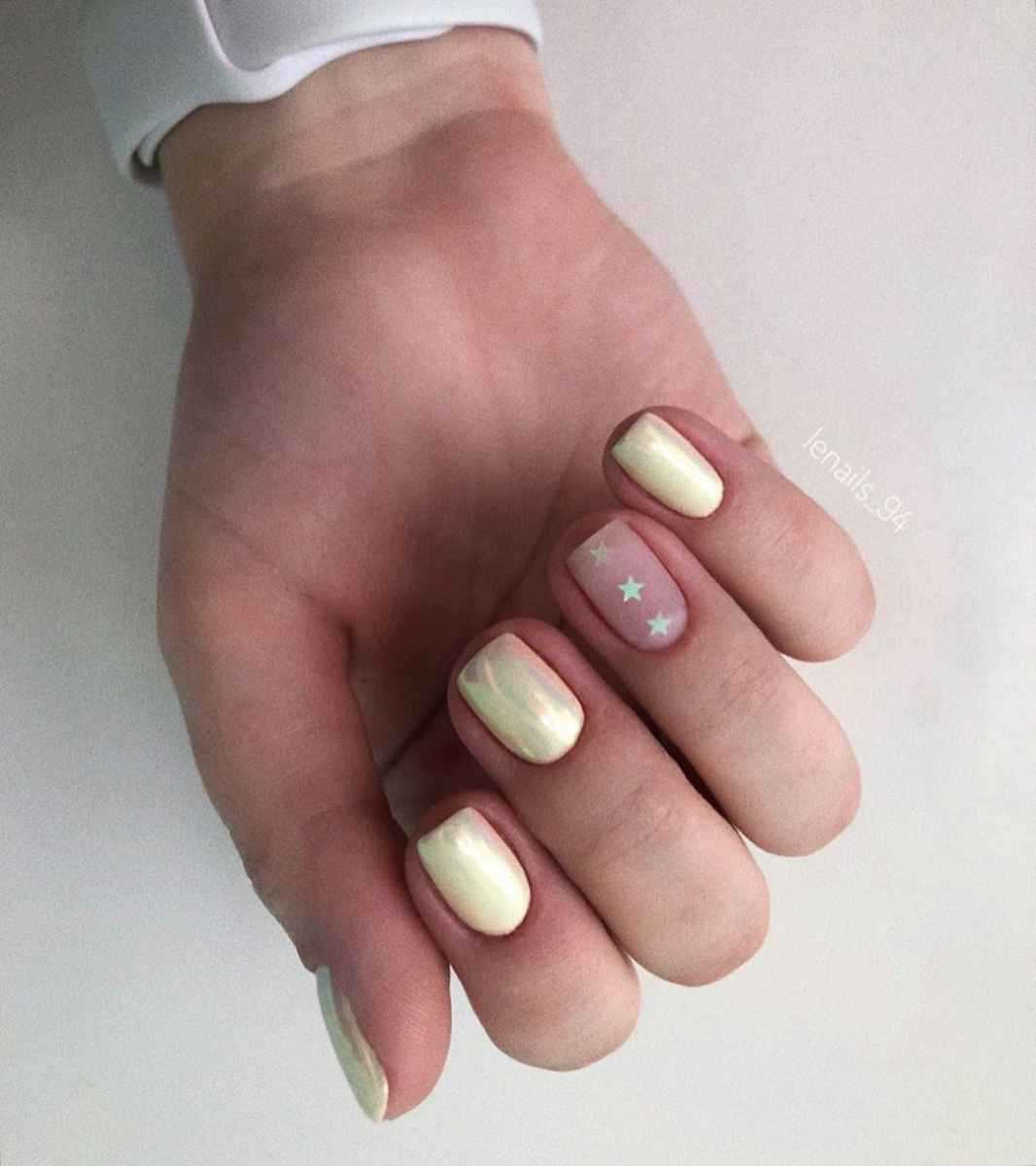 Несмотря на светлую нежную основу, ваши ноготки могут украсить яркие сверкающие звездочки. Добавьте к ним молодой месяц и вы — самая модная красотка на этом празднике жизни!