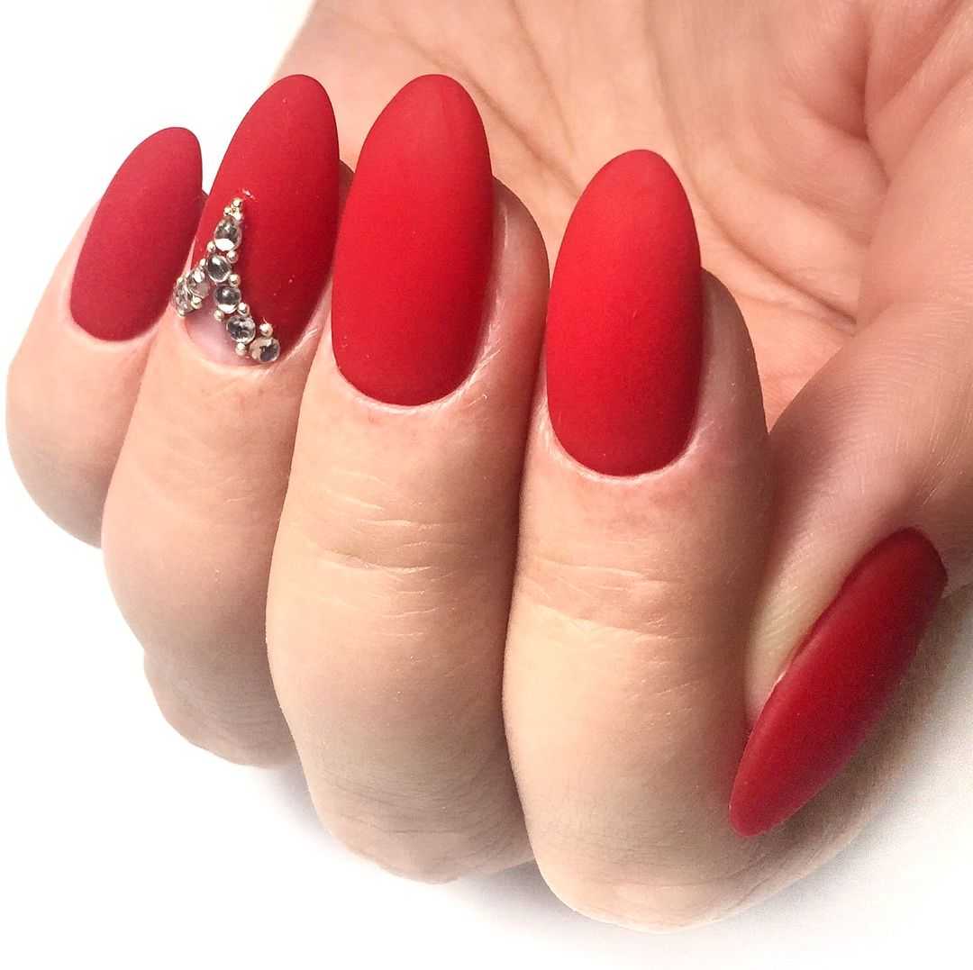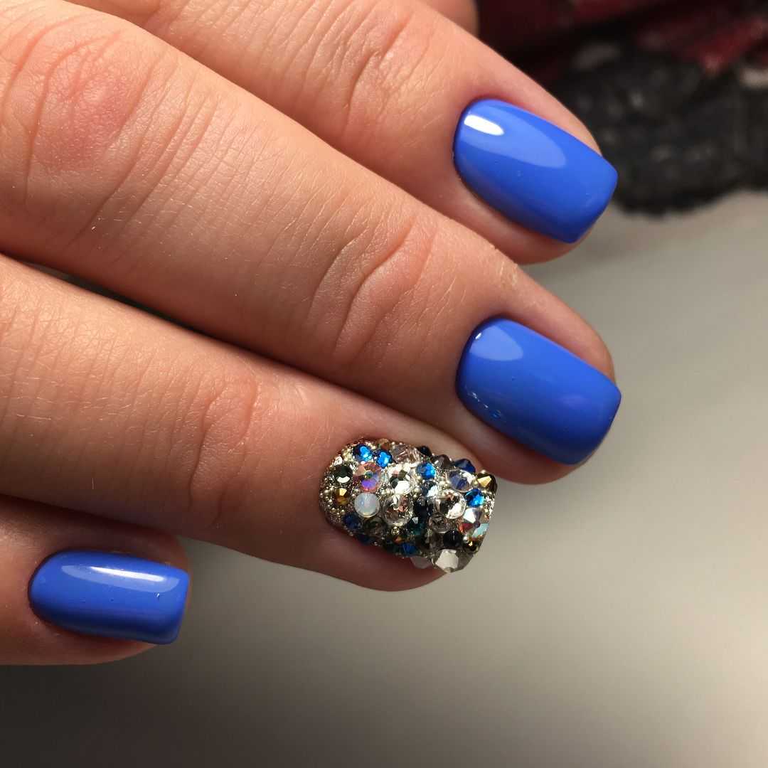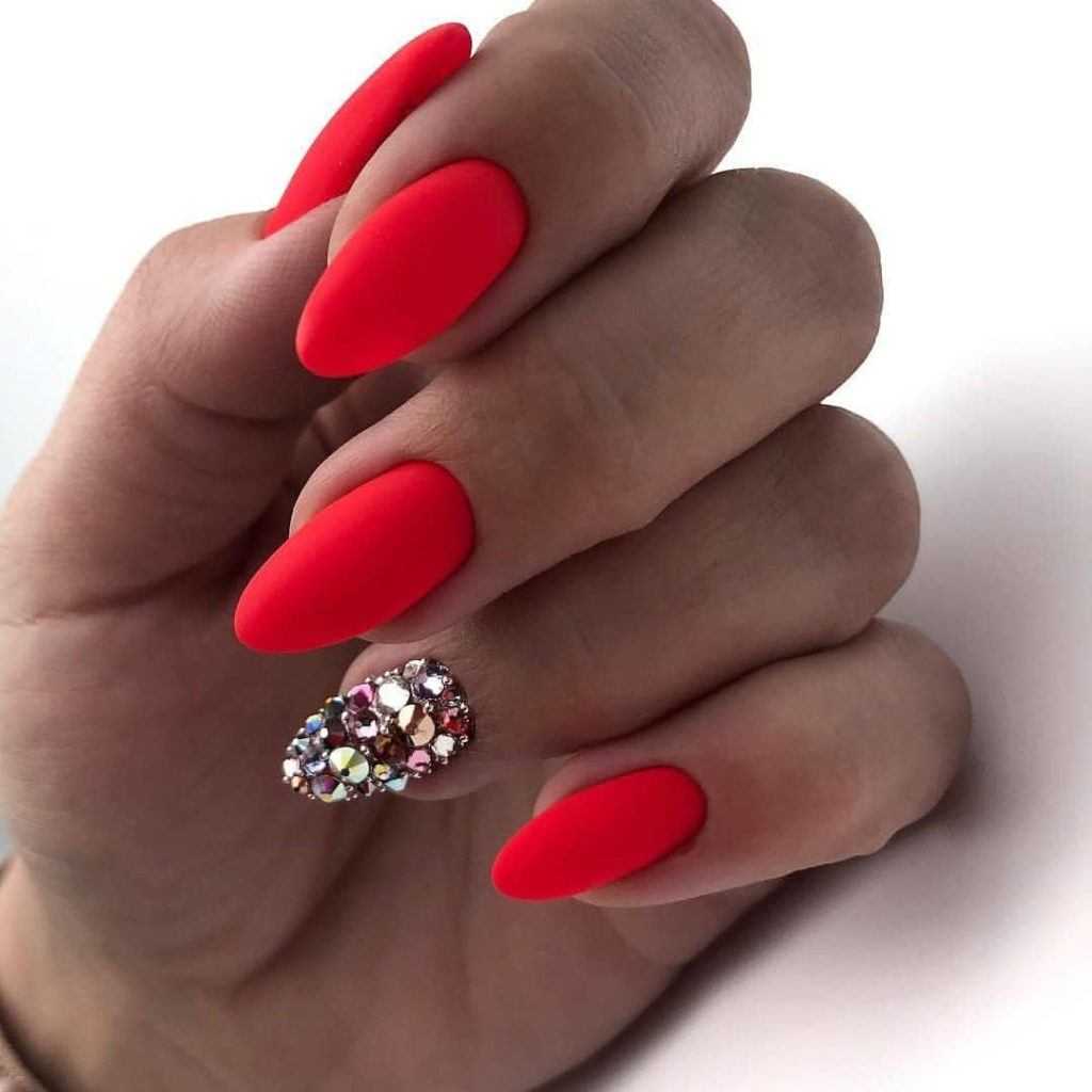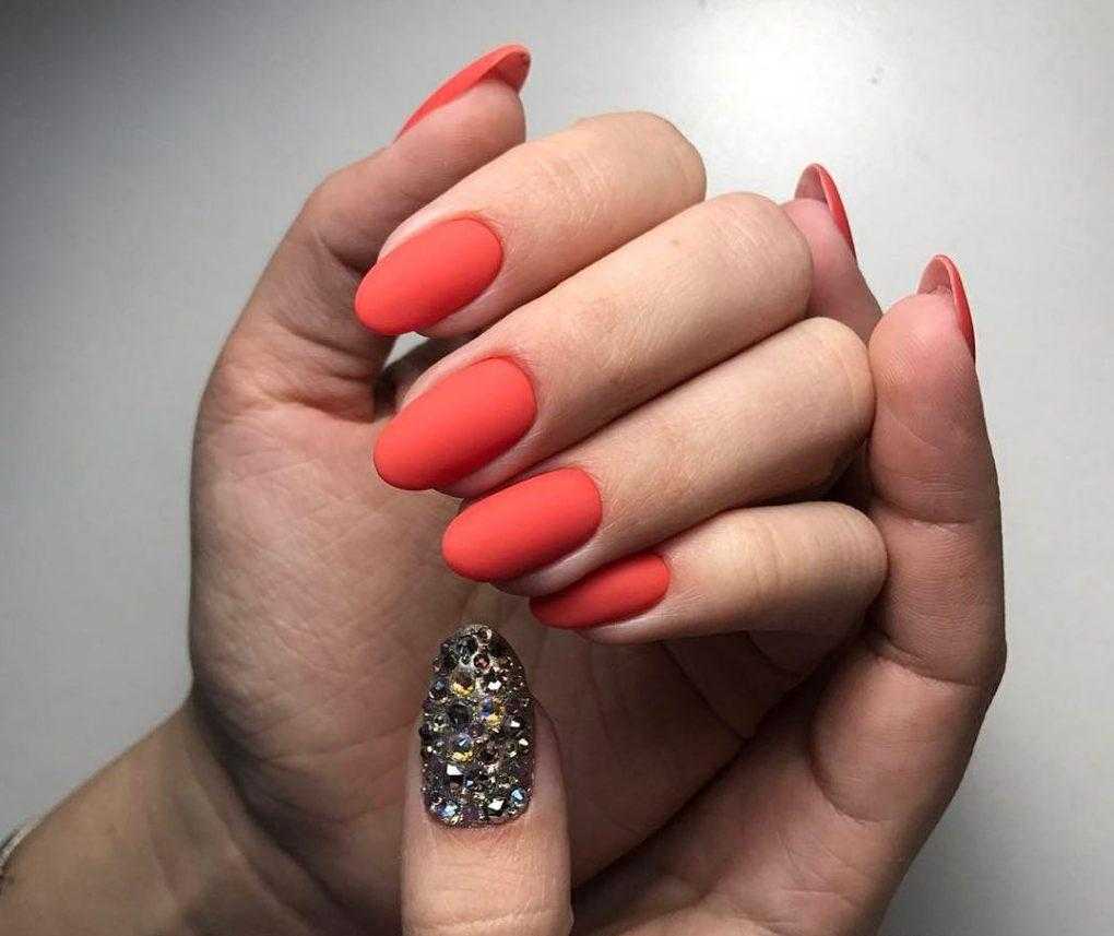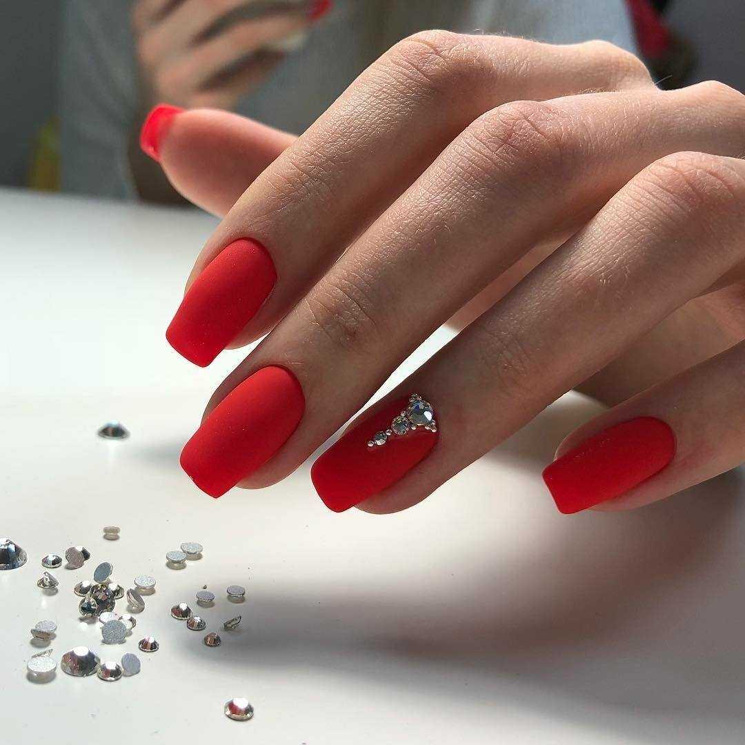 Все чаще яркий маникюр дополнительно покрывают специальным матовым лаком или топом. Благодаря чему оформление получается более сдержанным и в то же время элегантным. В то же время, стразы компенсируют утраченную яркость и преподносят маникюр совершенно по-другому. Ведь их блеск становится гораздо более заметным и эффектным. Это современное решение выбирают модницы для вечерних или праздничных образов. Особенно это касается покрытия в красном, изумрудном, синем и фиолетовом цвете.